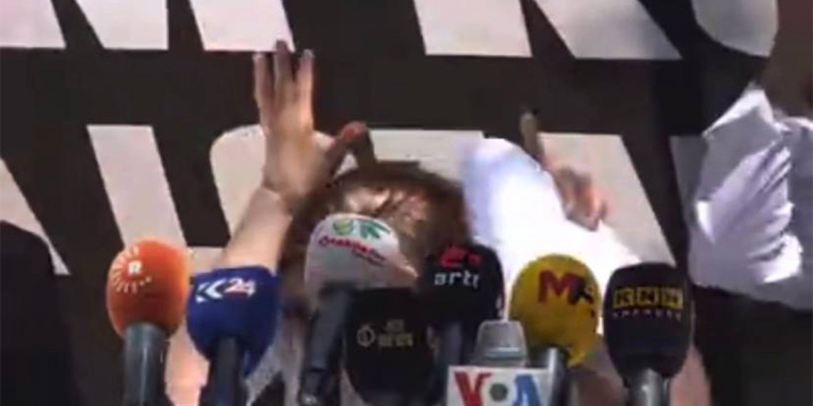 DBP Eş Genel Başkanı Saliha Aydeniz’in de aralarında olduğu bir grup, Lozan Antlaşması ile ilgili Yenişehir ilçesinde basın açıklaması yapmak istedi. Basın açıklaması için konulan masanın arkasına da platform kuruldu. DBP’li Aydeniz’in konuşması sırasında, arkadaki Kurtçe ‘Biz Kürtler Lozan’ı tanımıyoruz’ yazılı platform üzerine düştü. Aydeniz elleri ile başını korumaya çalışırken, o anlar kameraya yansıdı. Platformun kaldırılması ile Aydeniz, konuşmasına kaldığı yerden devam etti.