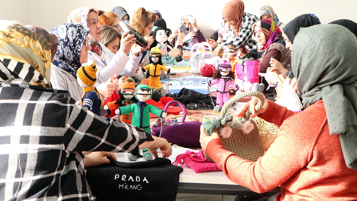 Yakutiye ilçesindeki Kazım Karabekir Meslek Atölyeleri’nde çalışmalarını sürdüren kadınlar, burada gün boyu yöresel yemek ve tatlıların yanı sıra kanaviçe, örgü bebek ile iplikten çanta gibi yüzlerce hediyelik eşya üretiyor. Kadınlar, ellerinde ilmek ilmek ördükleri birbirinden renkli ve desenlerdeki kadın çantalarını da firmalar aracılığıyla Brezilya’ya ihraç ediyor.
