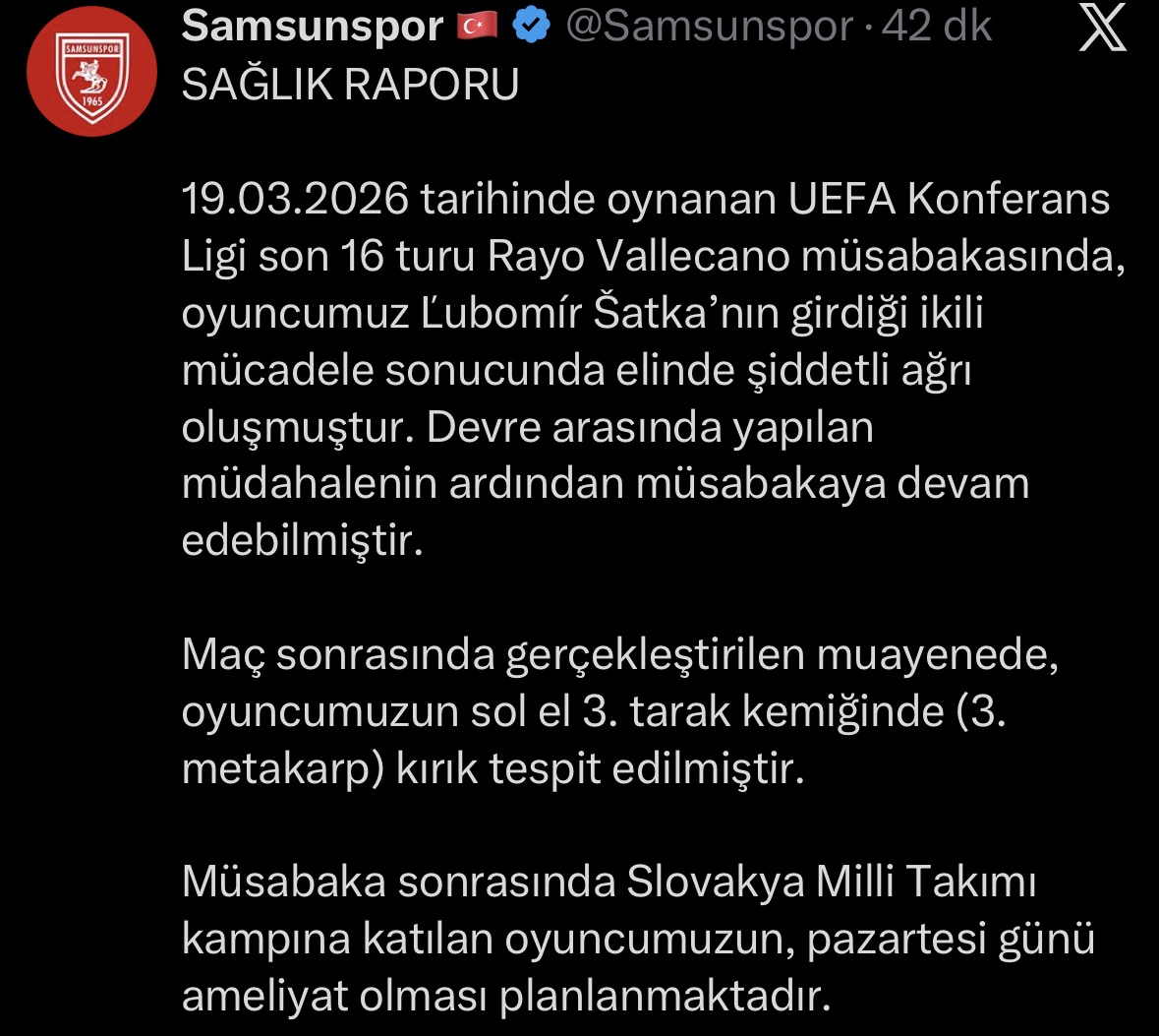 Samsunspor’un, 19 Mart 2026 tarihinde UEFA Konferans Ligi Son 16 Turu’nda deplasmanda İspanya temsilcisi Rayo Vallecano ile oynadığı karşılaşmada sakatlanan Slovak oyuncu Lubomir Satka’nın sol elinde kırık tespit edildi.