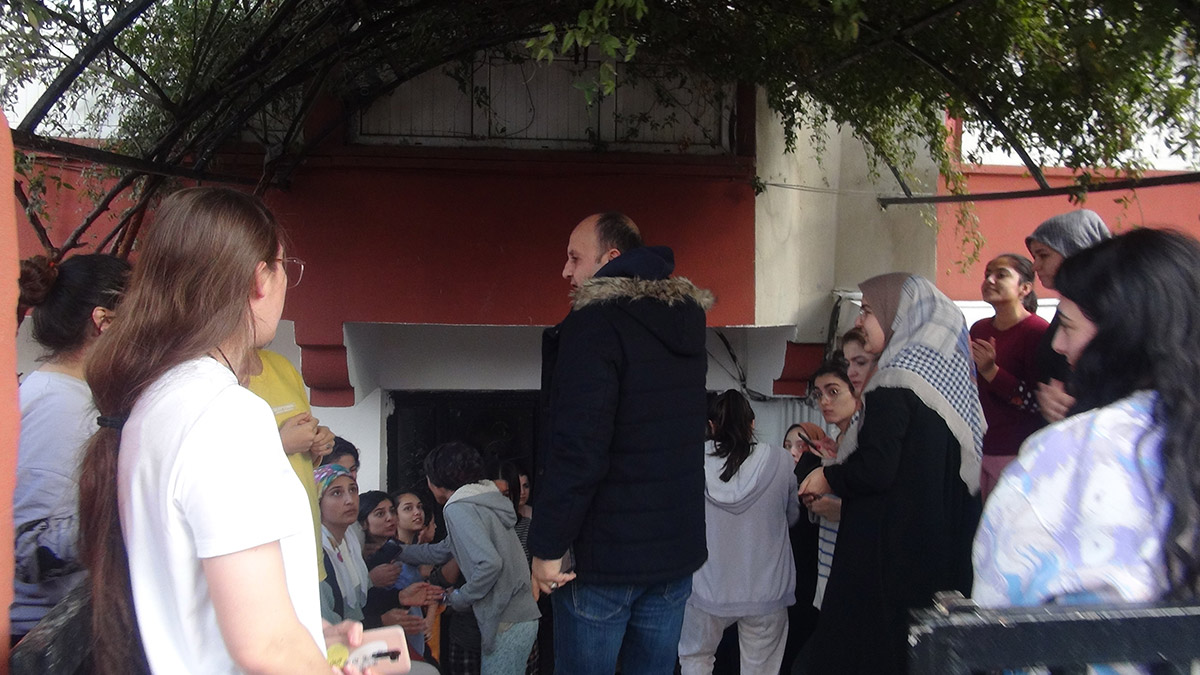 Kendilerine gerekçe gösterilmeden yurdun boşaltılmasının istendiğini belirten kız öğrenciler, terlik ve pijamalarıyla yurt binası önünde toplanıp, kararı alkışlarla protesto etti.