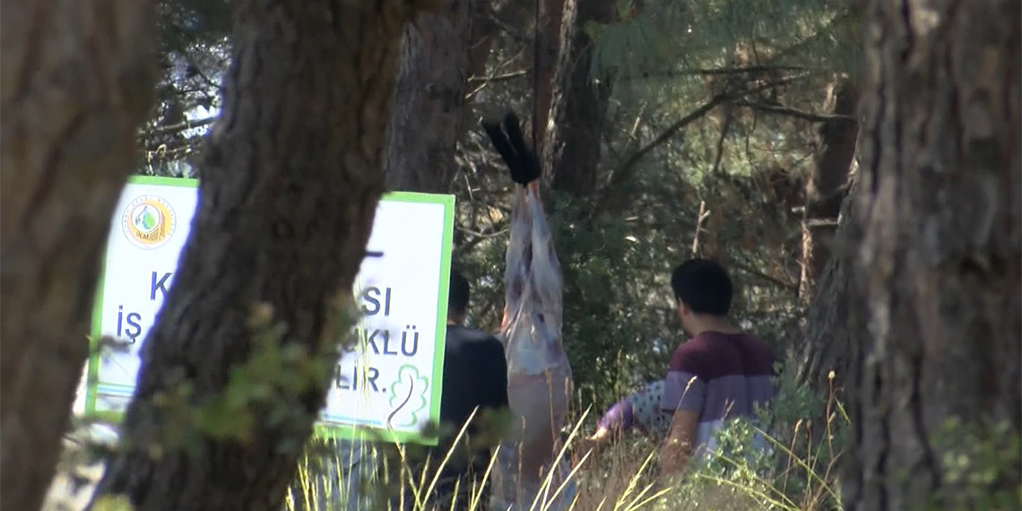 Tüm uyarılara rağmen Sarıyer’de ormanda kaçak kesimler yapıldı. Yasak olan ve hijyenik olmayan ortamlarda kesilen hayvanların etleri naylon brandaların üstüne konuldu.