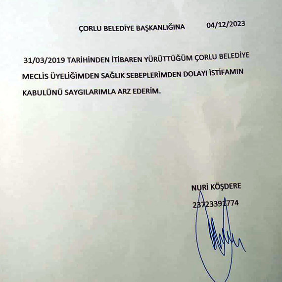 Parti teşkilatının disiplin kuruluna sevk ettiği Köşkdere, bugün Çorlu Belediye Başkanlığı’na gönderdiği dilekçesinde sağlık gerekçesiyle istifa ettiğini bildirdi. Köşkdere, dilekçesinde, “31/03/2019 tarihinden itibaren yürüttüğüm Çorlu Belediye Meclis üyeliğimden sağlık sebeplerimden dolayı istifamın kabulünü saygılarımla arz ederim” ifadelerini kullandı.