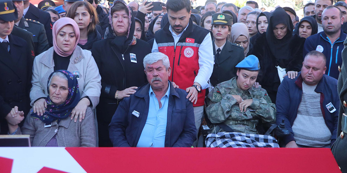 Serinkan’ın askeri üniforma giyen eşi Çilem Serinkan, eşinin Türk bayrağına sarılı tabutuna dakikalarca sarıldı. Cenaze törenine tekerlekli sandalyeyle getirilen ve askeri üniforma giyen şehidin bedensel engeli kardeşi Büşra Serinkan da ağabeyinin fotoğrafına bakıp, gözyaşı döktü. 2016 yılında Suriye’de teröristlerle çıkan çatışmada gazi olan şehidin ağabeyi Hüseyin Serinkan da kardeşini son yolculuğuna uğurladı.