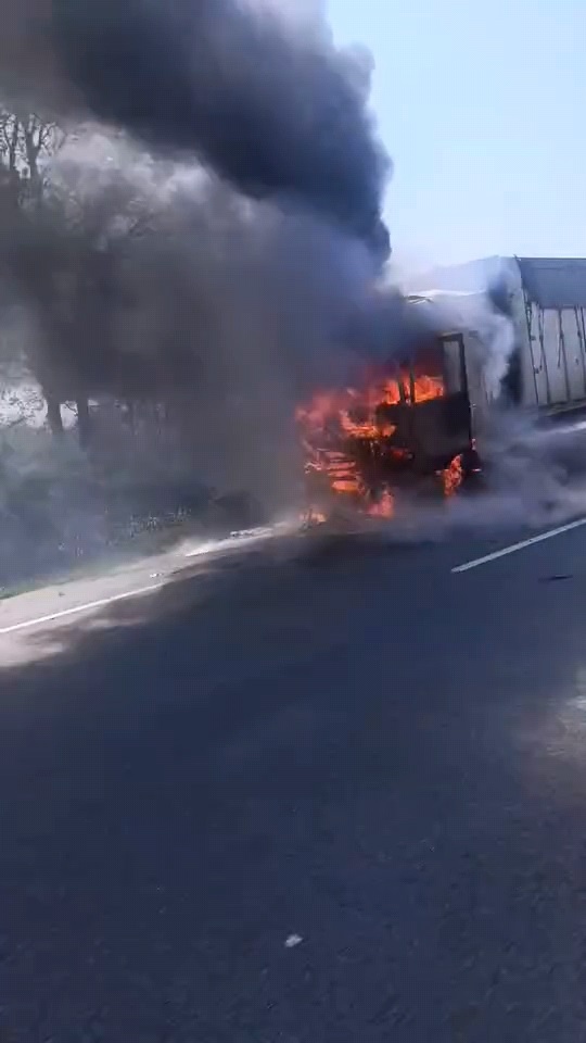 Bursa'nın İnegöl ilçesinde seyir halindeyken alev alan TIR, kullanılamaz hale geldi.