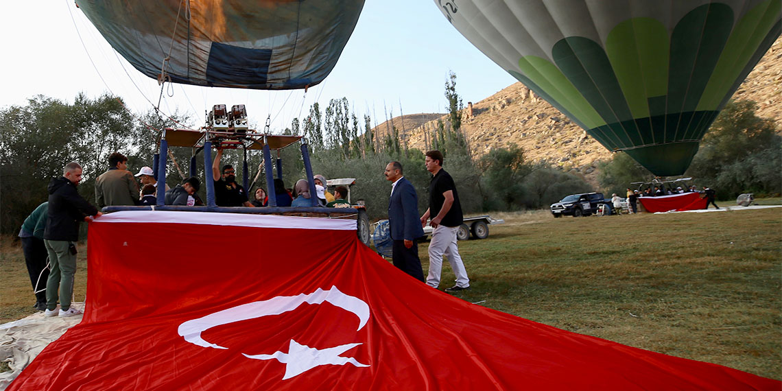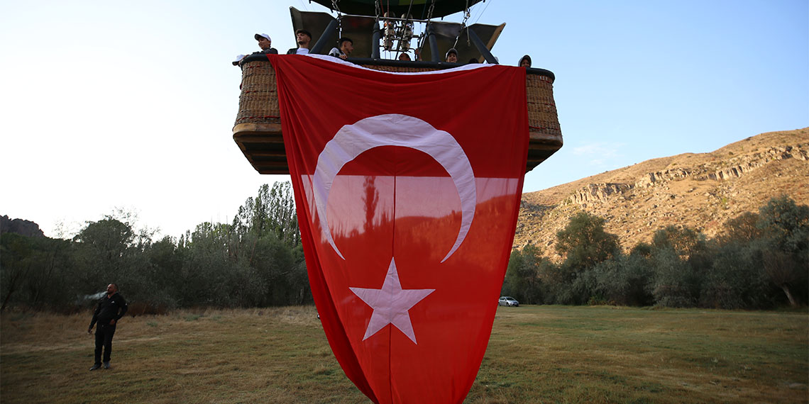 Kapadokya’nın incisi Ihlara Vadisi’nde sıcak hava balonlarından bazılarının sepetine 30 Ağustos Zafer Bayramı’nın 102’nci yıl dönümü nedeniyle Türk bayrakları asıldı. Aksaray Valiliği tarafından Sevgi Evleri’nde kalan çocuk ve gençler için özel ‘zafer uçuşu’ düzenlendi. Sevgi Evleri’nde kalan 35 çocuk, sıcak hava balonu ile yapılan uçuşta Türk bayrağı açarak, şanlı zaferin 102’nci yıl dönümünü kutladı.