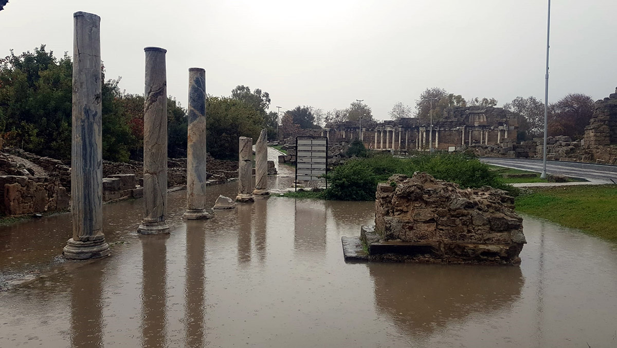 Diğer yandan şiddetli yağış nedeniyle Side Antik Kenti’de Sütunlu Cadde ve Tyke Tapınağı’nın bulunduğu alan su altında kaldı. Dün yapılan şiddetli yağış ve fırtına uyarısının ardından Side Limanı’nda bulunan tekne ve motorlar sahipleri tarafından güvenli yerlere çekildi. Yağış nedeniyle Apollon Tapınağı da boş kaldı.