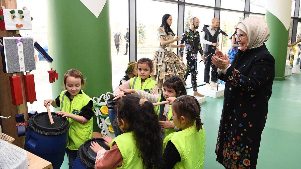 Çocukların da yakın ilgi gösterdiği Emine Erdoğan, 6 yaşındaki Reyyan Güleç Muslu’nun, “Sıfır atık aynı zamanda israfı önleyen bir şeydir. İnsanların ve hayvanların yaşamını kolaylaştırır, daha iyi konuma getirir” sözlerini alkışlayarak, onu tebrik etti. Küçük Reyyan, Emine Erdoğan’ın isteği üzerine burada atıklardan yapılan ürünleri tek tek anlattı. Erdoğan, diğer çocuklara da söz verdi. Daha sonra merkezdeki kompost üretim alanını gezen Emine Erdoğan, Çevre, Şehircilik ve İklim Değişikliği Bakanlığı tarafından verilen el ve pedal yardımıyla manuel çalışan kompost makinelerini de inceledi.
