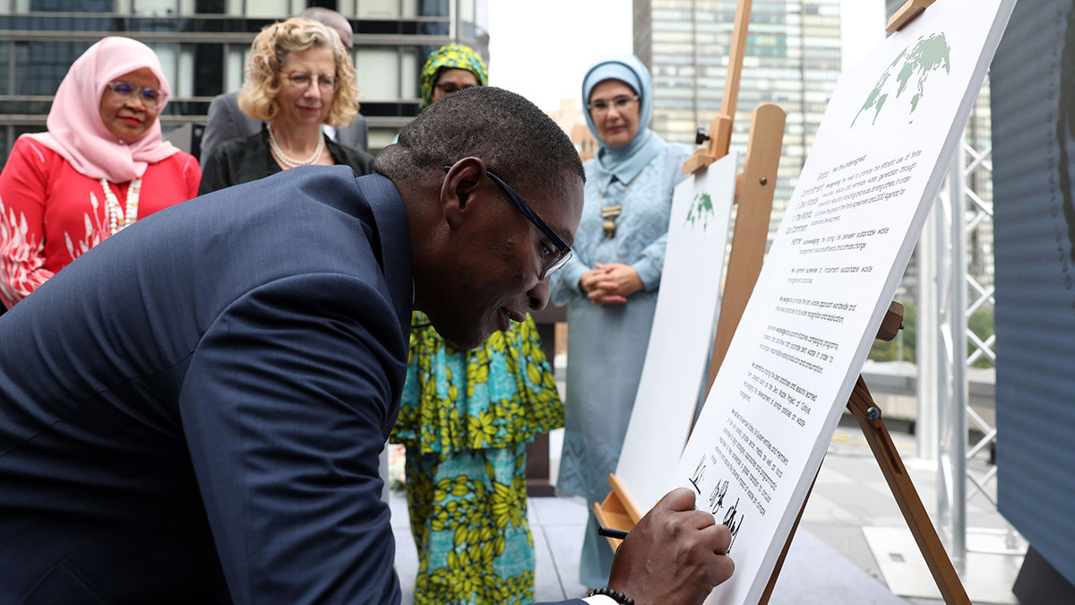 Konuşmasında, BM Çevre Programı (UNEP) İcra Sekreteri Inger Andersen, BM Habitat İcra Sekreteri Maimunah Şarif ve BM İklim Özel Temsilcisi Selwin Hart’a Sıfır Atık Projesi’ne verdikleri destekten dolayı teşekkür eden Emin Erdoğan, programda hazır bulunan bazı ülke başkanlarının eşlerini ve çevre bakanlarını da BM direktörleri ile birlikte, Guterres’le yapılan Sıfır Atık Niyet Beyanına destek imzalarını atmak üzere platforma davet etti. BM direktörlerinin yanı sıra, programda hazır bulunan bazı ülkelerin First Lady’leri ve Çevre Bakanları da Emine Erdoğan ve Genel Sekreter Guterres’in kararını aldıkları Sıfır Atık Niyet Beyanına imza atarak destek verdi.