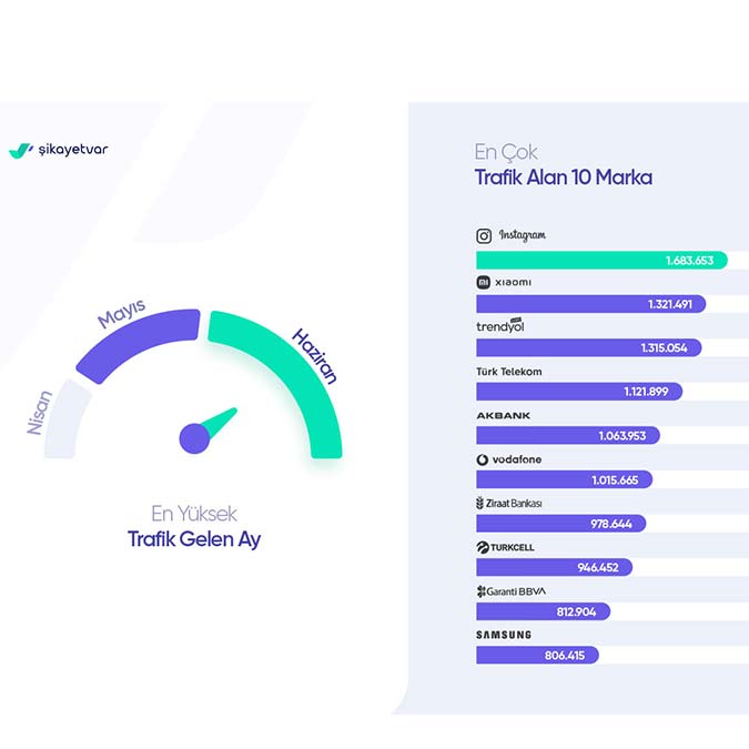 Yılın ilk 6 ayında Şikayetvar’da, sayfası en çok aranan marka 1 milyon 683 bin 653 sayfa görüntülenmesiyle Instagram oldu. Instagram’ı, Xiaomi, Trendyol, Türk Telekom ve Akbank izledi.