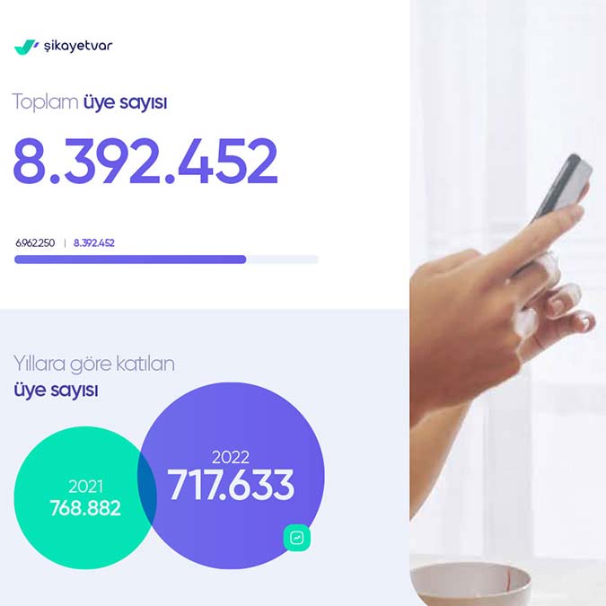 Şikayetvar’a 2022’nin ilk 6 ayında toplam 717 bin 663 yeni üye katıldı. Toplam üye sayısı 8 milyon 392 bin 452’ye ulaştı. Tüketicilerin bir referans kaynağı olarak başvurduğu ve satın alma kararıyla ilgili araştırma yaptığı platformda yılın ilk 6 ayında toplam 220 bin 486 şikayet çözüme kavuştu.