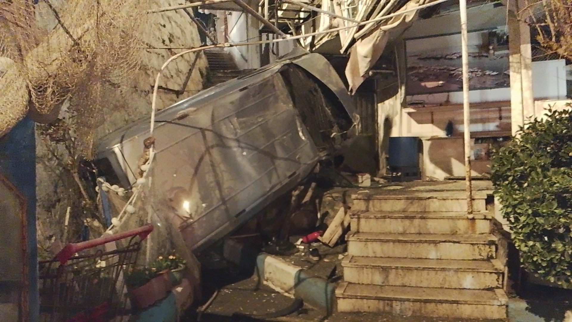 Silivri'de sürücüsünün direksiyon hakimiyetini kaybettiği hafif ticari araç, 5 metre yükseklikten restoranın duvarına çarparak düştü.