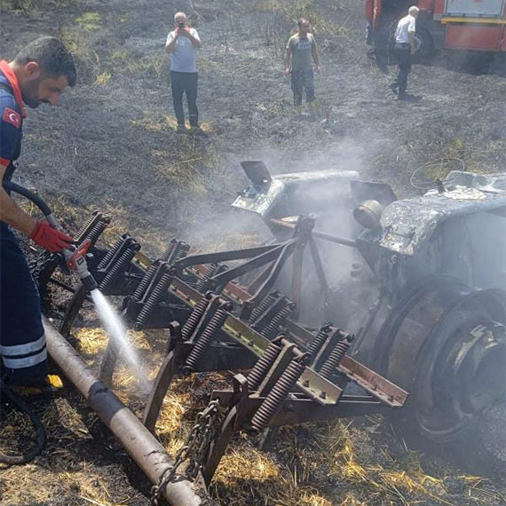 Silvan’daki anız yangını, ekiplerin 9 saatlik çalışmasıyla söndürüldü. Alevlerin arasında kalan bir traktörün kullanılamaz hale geldiği yangında 12 bin dönüm arazi zarar gördü.