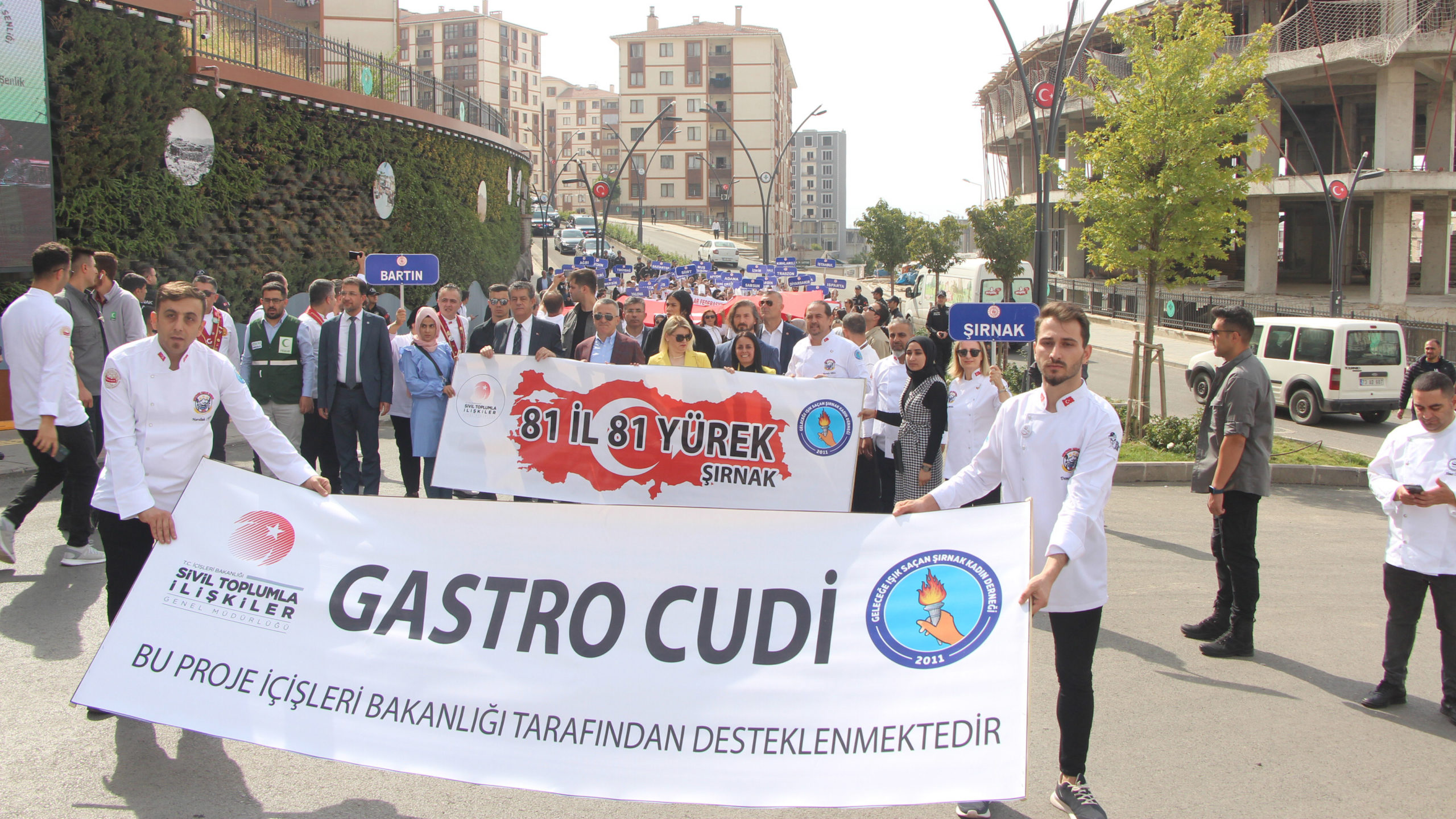 ‘Şırnak Gastro Cudi’, Ömer Kabak Meydanı’ndaki bayrak yürüyüşüyle başlarken, etkinliğe Şırnak Valisi Osman Bilgin, Belediye Başkanı Mehmet Yarka, Rektör Prof. Dr. Abdurrahim Alkış, Geleceğe Işık Saçan Kadın Derneği Başkanı Hatice Atan ve 81 ilden gelen aşçılar katıldı. Katılımcılar, dev Türk bayrağı açarak Cumhuriyet Meydanı’na kadar yürüdü. Burada kurulan stantları gezen katılımcılar, yöresel yemekleri tattı.