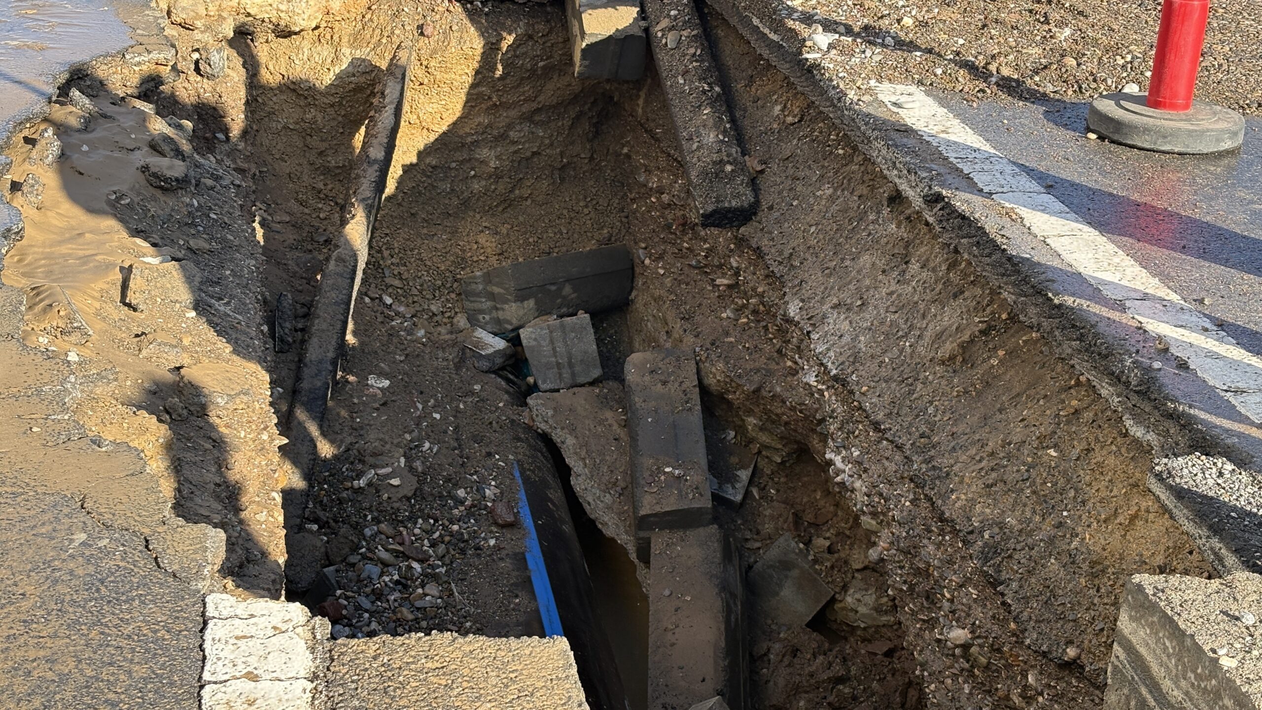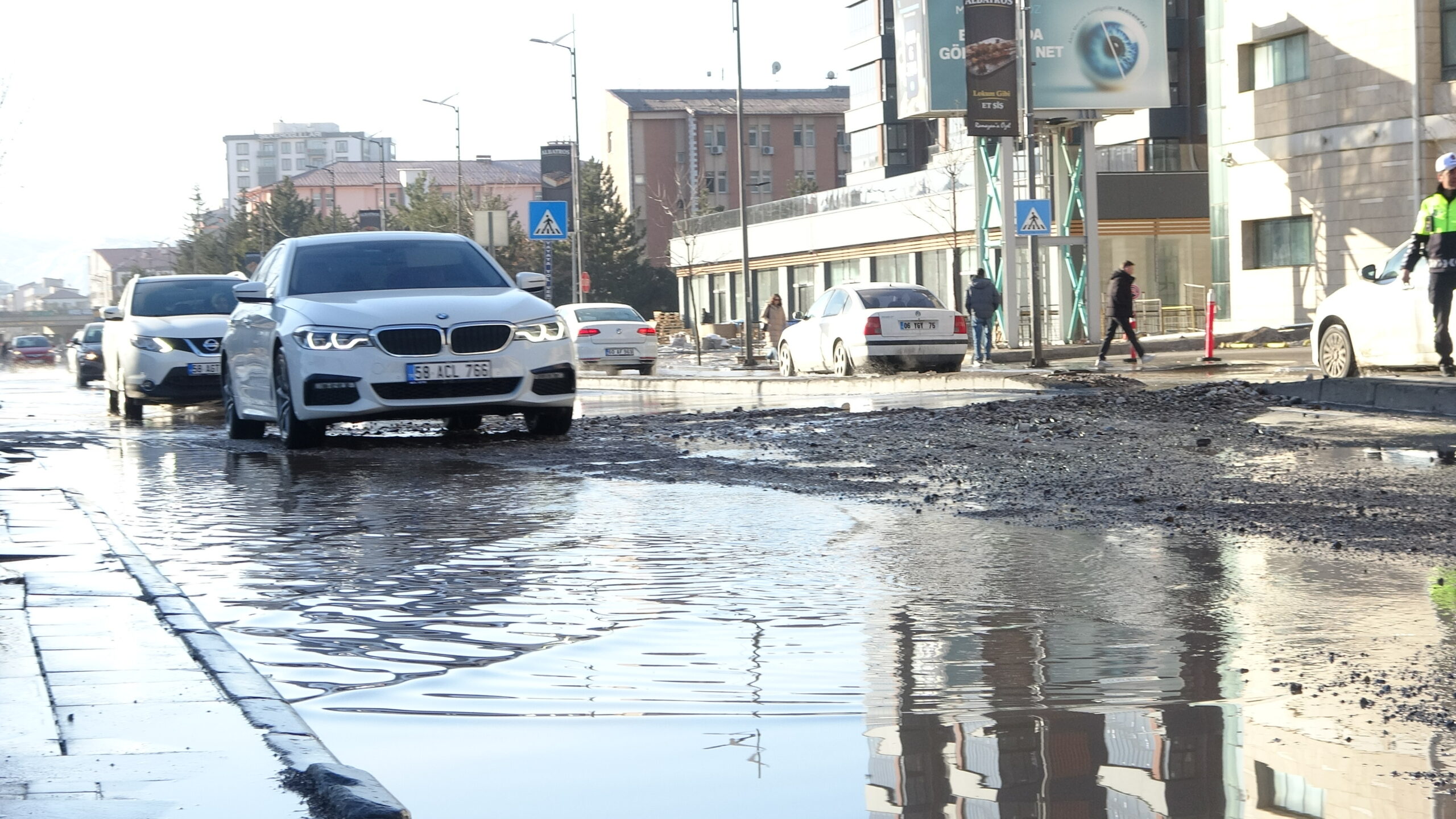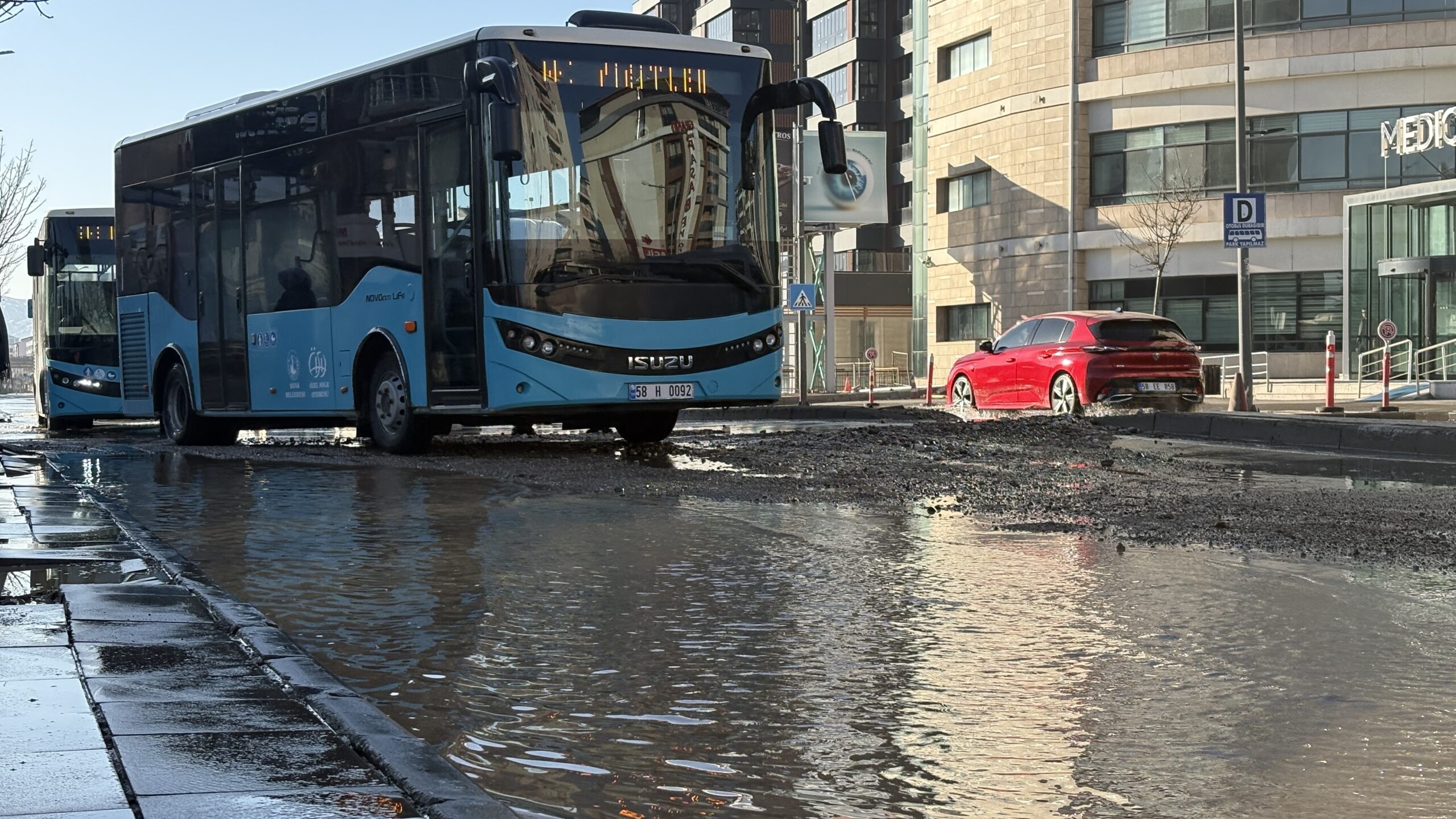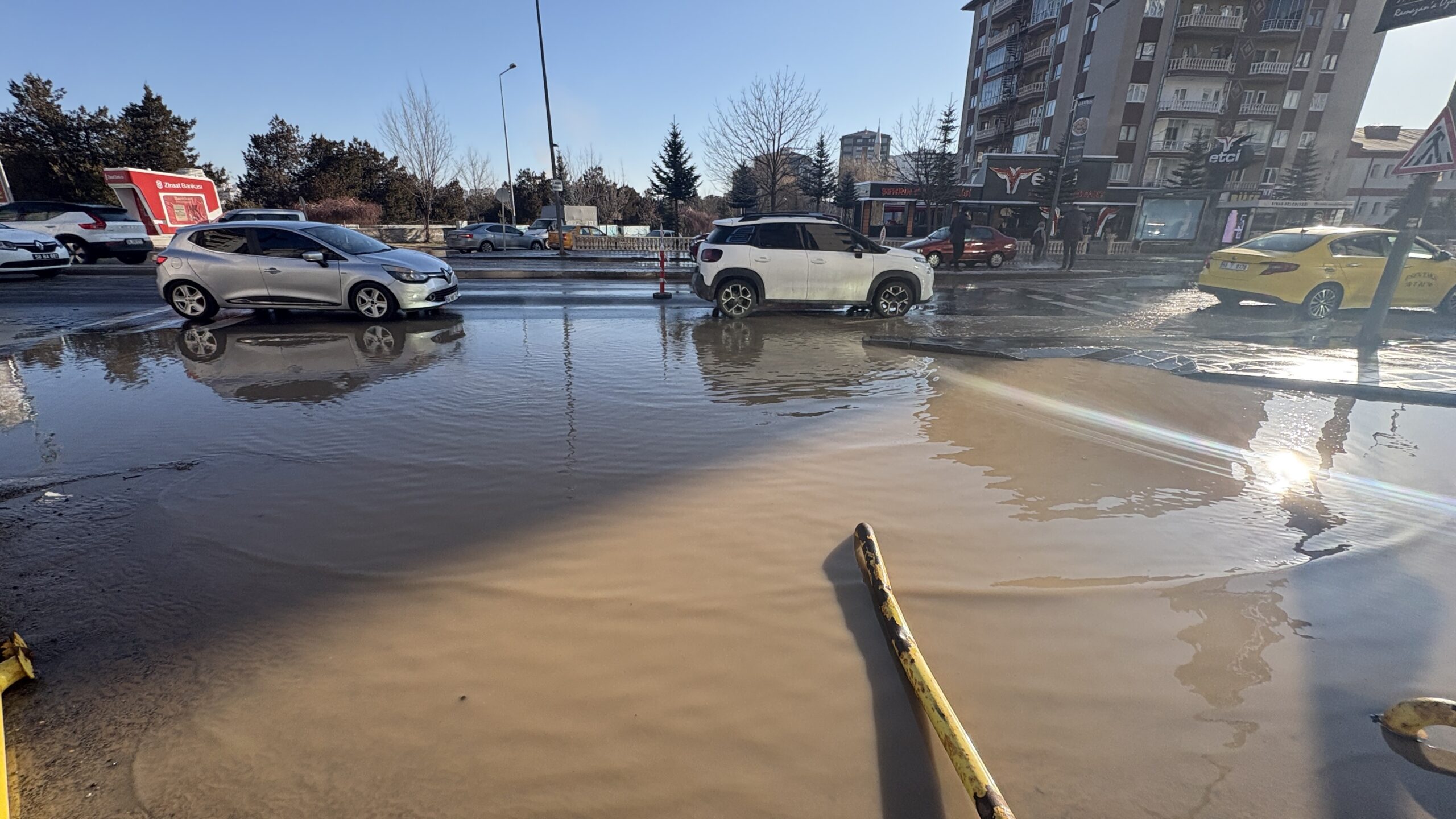 Sivas'ta ana şebeke su borusunun patlaması sonucu cadde göle döndü; bir kısmı çöken yol nedeniyle trafik aksadı.
