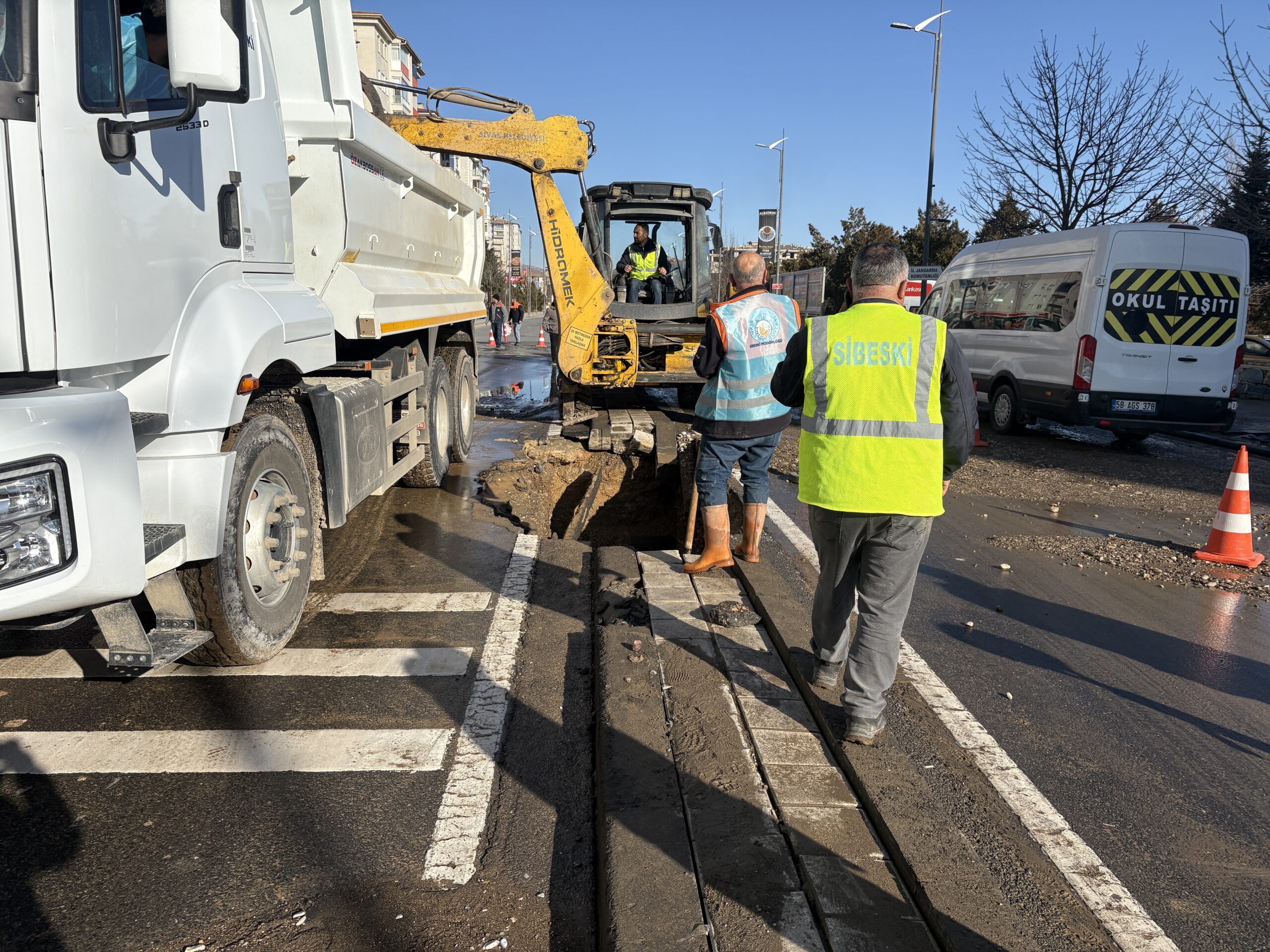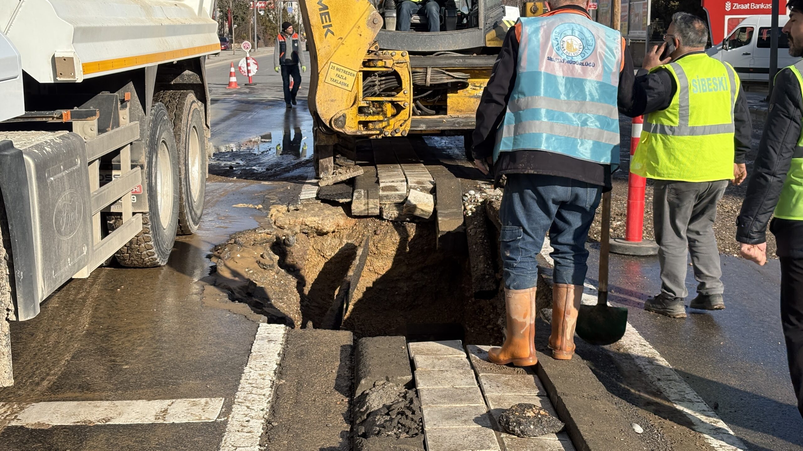Sivas Belediyesi Su ve Kanalizasyon İşleri Müdürlüğü'ne (Sibeski) de haber verildi. Caddeye gelen Sibeski ekipleri, vanayı kapatarak suyu kesti. Yolda oluşan su birikintileri nedeniyle sürücüler ilerlemekte güçlük çekerken, vatandaşlar da karşıdan karşıya geçmekte zorlandı. Sibeski ekipleri, borunun değişimi için çalışma başlattı.