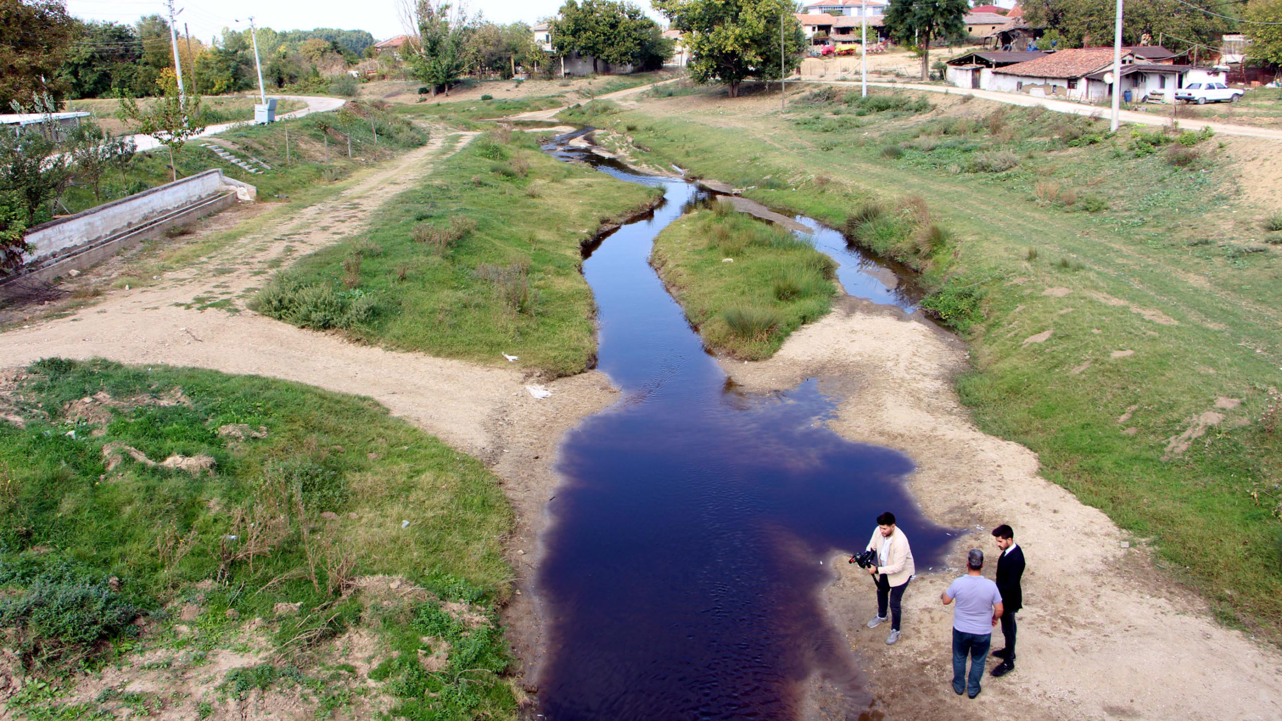 Köyümüzün 3 kilometre üzerinde katı atık bertaraf tesisi, yani yeni şehir çöplüğümüz var. Burada biriken suları, serbest bir şekilde salımı yapıyorlar ve deremiz bu halde koyu renk akıyor. Yaklaşık 1 saat önce bana haber geldi. Hemen Çevre, Şehircilik ve İklim Değişikliği Müdürünü, Valiliği aradım. Tarım ve Orman İl Müdürlüğü ve Ziraat Odası’nı bilgilendirdik.