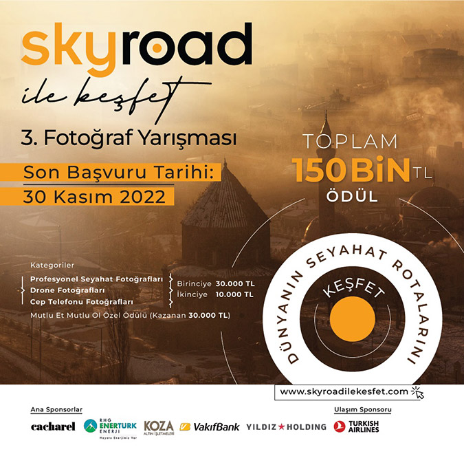 Başta seyahat olmak üzere kültür-sanat, edebiyat, sinema, müzik, tarih, psikoloji ve yaşama dair her konuda özgün ve yenilikçi içerikler sunan Skyroad’un bu yıl ‘Dünyanın Seyahat Rotalarını Keşfet’ temasıyla düzenlediği yarışma için son başvuru tarihi 30 Kasım olarak açıklandı.