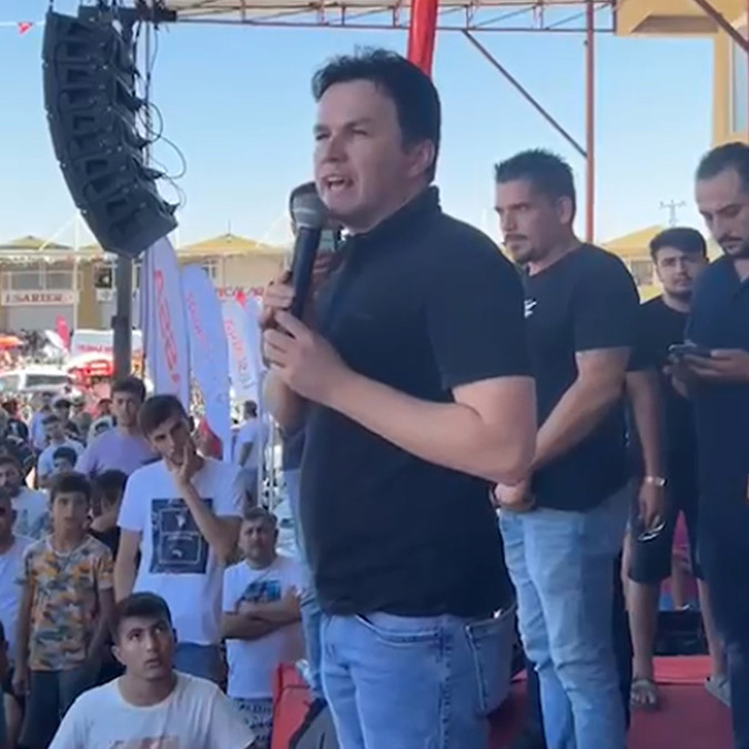 “Biraz önce bizim de kontrolümüz dışında bir kendini bilmez arkadaşımız, bunu tespit ettik. Buradan sesleniyorum, bu kadar güzel bir organizasyonda, bu kadar kişi burada toplandı. Çünkü burada iyi bir zaman geçirmek istiyoruz. Buna kimsenin gölge düşürmesine izin vermem arkadaşlar. Buna izin vermeyeceğim. Bu arkadaşın arkasında kim varsa buradan sesleniyorum. Yarından itibaren iki elim yakasında, benim boynumun borcu ortaya çıkarmak.