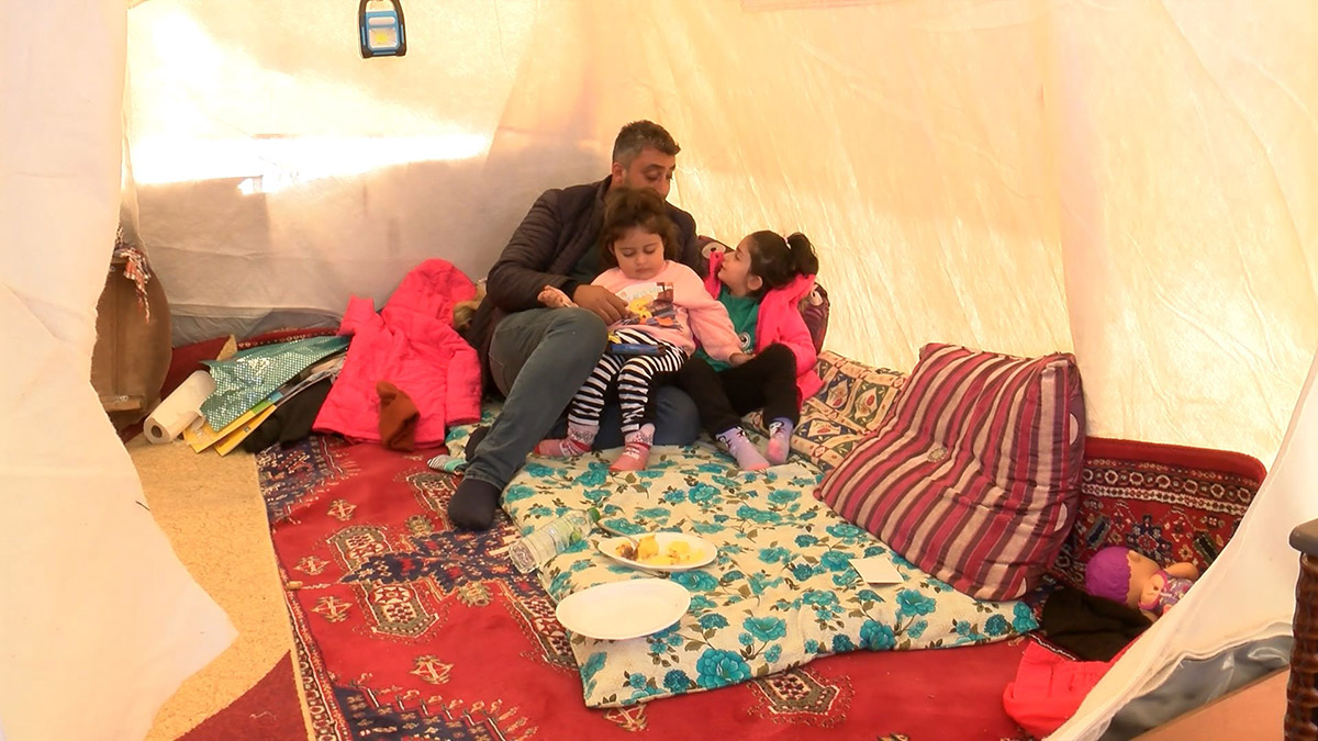Evlerinin ağır hasarlı olduğunu belirten Baba Sabri Evren, “Ev ağır hasarlı, işyeri yıkıldı. Benim çocuğum SMA hastası, tedaviye ihtiyacı var. Çocuğun ne malzemelerini alabildik ne fizik tedaviye gidebildik, tamamıyla mağduruz. Bu çadırın içinde biz 11 kişi yaşıyoruz. Burası soğuk bir memleket, dün akşam çocuğun ateşi 41 dereceydi. Bizim en azından kafamızı sokabileceğimiz bir yer için destek bekliyoruz. Zor bir durumdayız, Allah kimseye yaşatmasın. Tabi ki şu an ülke zor durumda ama çocuğun da ihtiyacı var” dedi.