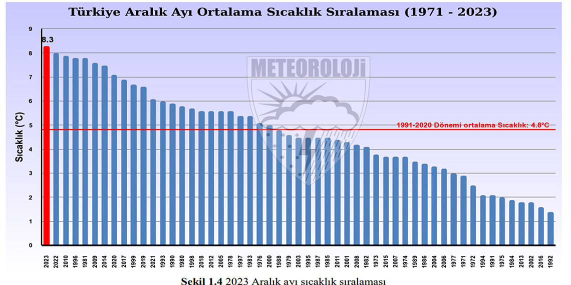 Meteoroloji Genel Müdürlüğü’nün 2023 Aralık ayı sıcaklık ve yağış raporları hazırlandı. 1991- 2020 normalleri aralık ayı ortalama sıcaklığı 4,8 derece olurken, 2023 Aralık ayı sıcaklığı ise 8,3 derece gerçekleşti. 2023 Aralık ayı ortalama sıcaklıkları, uzun yıllar normaline göre 3,5 derece artış gösterdi. 2023 yılı Aralık ayı ortalama minimum sıcaklıkları, 1991-2020 minimum sıcaklık normallerinin 5,1 derece, ortalama maksimum sıcaklıkları da normallerinin 2,8 derece üzerinde gerçekleşti. 2023 yılı Aralık ayı, kayıtların tutulduğu son 53 yılın en sıcak aralık ayı olarak kayıtlara geçti.