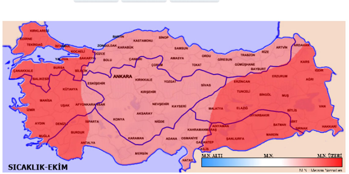 Ekim ayında hava sıcaklığının batı kesimler ile Doğu ve Güneydoğu Anadolu’da mevsim normallerinin 1 ila 2 derece üzerinde, diğer yerlerde ise mevsim normallerinin 0,5 ila 1 derece üzerinde seyredeceği bekleniyor. Yağışın yurt genelinde mevsim normalleri civarında gerçekleşeceği öngörülüyor.