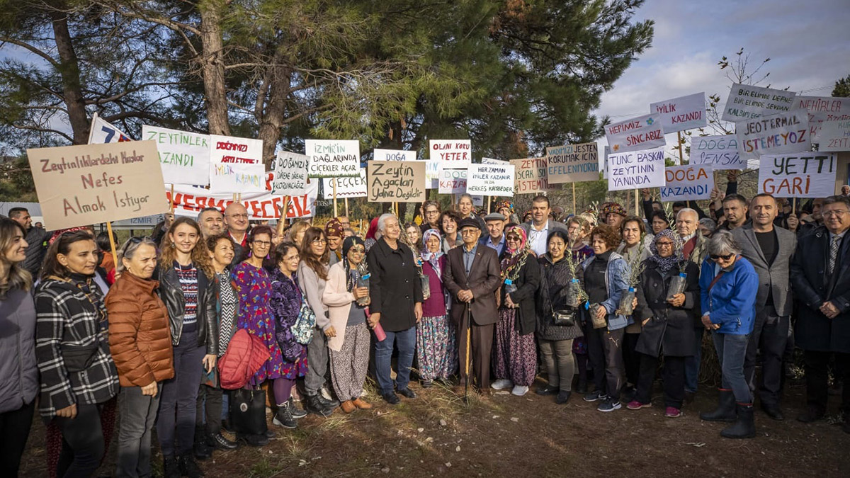 Başkan Tunç Soyer’i alanda “Yetti gari”, “Zeytin Ağaçları Yalnız Değildir”, “Tarım Alanlarımızın Yok Olmasına İzin Vermeyeceğiz”, “Zeytinliklerdeki Kuşlar Nefes Almak İstiyor” yazılı dövizler karşıladı. Törende konuşan Başkan Soyer, “Zeytin fidanı dağıtımına başlarken amacımız aslında meclise intikal eden ‘Zeytinliklerin Madene Açılması’yla ilgili yasa tasarısının iptalini dillendirmek, onunla mücadele etmekti. Çok şükür geri adım attılar yine vazgeçtiler. Bunun heyecanını yine beraber paylaşalım. Onlar defalarca deniyorlar. ‘Acaba direnç görmezsek bu defa başarır mıyız?’, ‘Direnç görmezsek zeytinlikler madene açılır mı?’ diye uğraşıp duruyorlar. Biz buna izin vermeyeceğiz” dedi