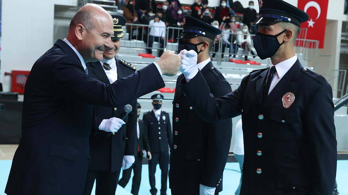 Soylu, uyuşturucuya karşı da ciddi bir mücadele yürütüldüğünü belirterek “Uyuşturucudan içeride bulunan torbacılar var ya, onların sayısı 35-36 bin civarındaydı. Bugün uyuşturucudan hapishanede bulunanların sayısı 96 bin. Kimseye aman vermiyoruz. Ve evlatlarımıza uyuşturucu satmaya çalışanlara fırsat vermiyoruz” ifadelerini kullandı. Konuşmalarından ardından yemin eden polisler, keplerini havaya atarak mezuniyet sevincini yaşadı.