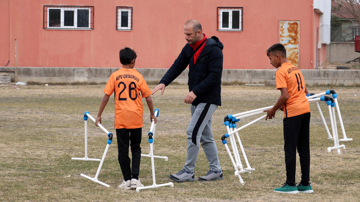 Eskişehir’in Alpu ilçesinde, beden eğitimi öğretmeni Orhan Demir (38), aralarında mevsimlik tarım işçisi ailelerin çocuklarının da yer aldığı öğrencilerden oluşturduğu kız-erkek atletizm takımlarını, su borularından engelli koşu parkuruyla yarışlara hazırlıyor.