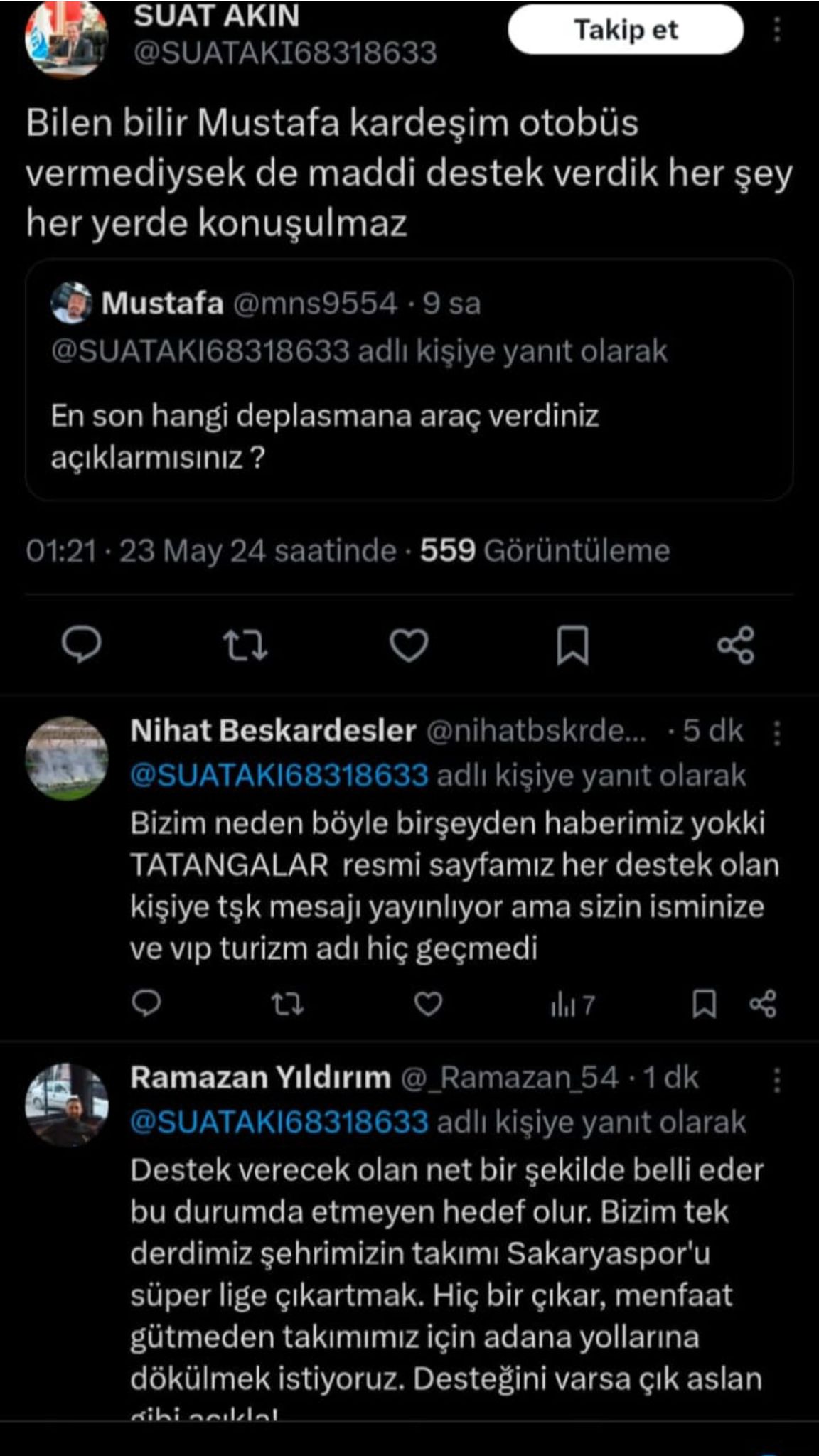 Açıklamasında bulunduğu gönderiyi gören Sakaryaspor taraftarları, Tatangalar, sosyal medyada güçlerini bir kez daha göstererek, Sakarya Vip Turizm’e karşı “Yalan söyleme başkan” gibi yorumlar yapmışlardır. Bu durum, Google üzerinde Sakarya Vip Turizm’e yüzlerce linç yorumunun yağmasına neden oldu. Bunun üzerine Suat AKIN, açıklamalarda bulundu. Ancak, bu olayın iş dünyası ile spor arasındaki ilişkileri nasıl etkilediği ve gelecekte benzer durumların nasıl yönetileceği konusu hala tartışma konusu olabilir. Her iki tarafın da anlayış ve iş birliği içinde olması, sporun toplumsal birliği sağlamadaki önemini vurgulayan bir sonuç olabilir. Özellikle, benzer durumlarda iletişimin açık ve şeffaf olması, taraftarlar ile işletmeler arasındaki gerilimi azaltabilir.