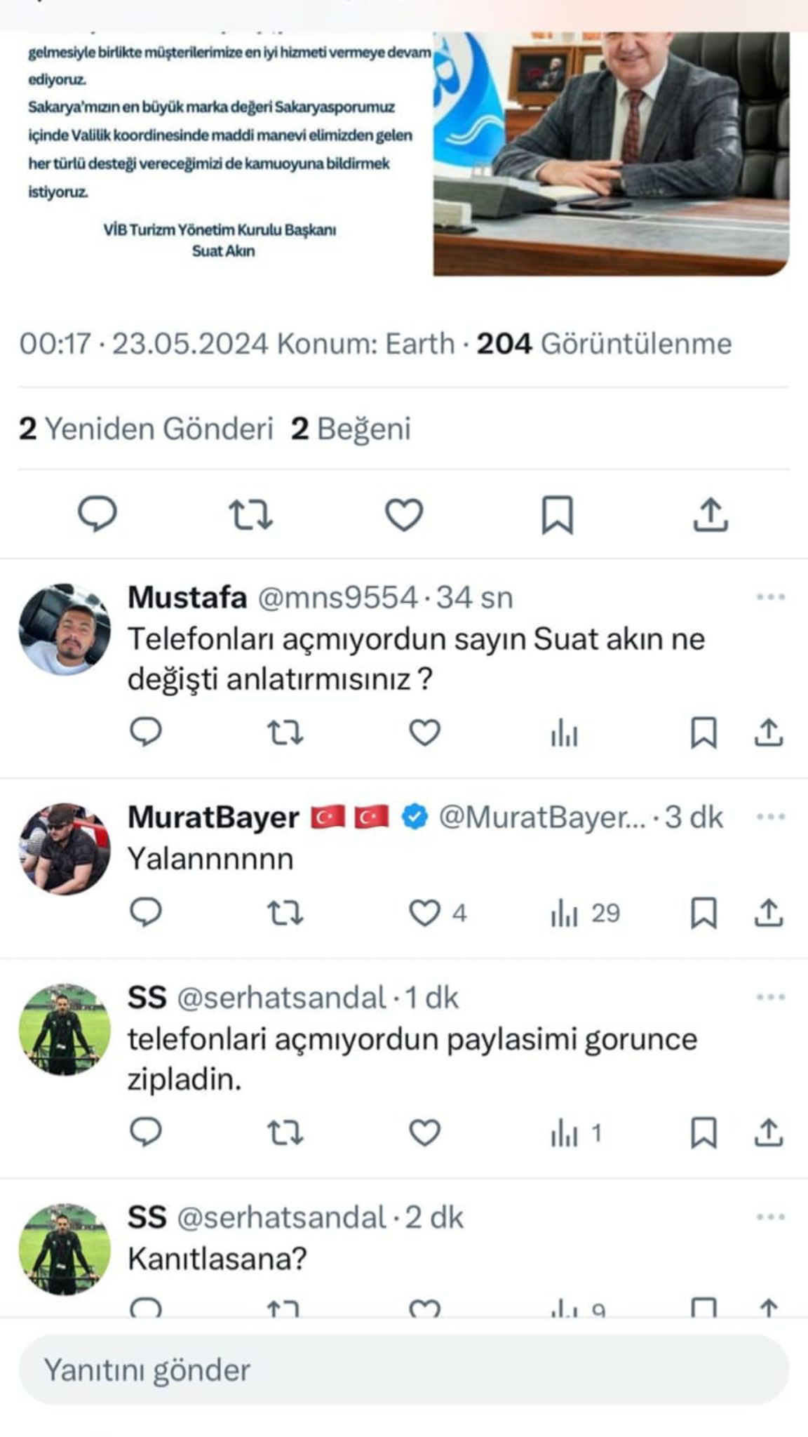 Diğer yandan, Suat Akın’ın yaptığı açıklamaların ardından, Sakaryaspor taraftarlarının bir kısmı, VİB Turizm’e karşı önyargılı olarak hala büyük bir öfke ve hayal kırıklığı hakim.