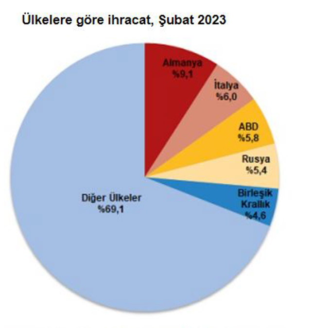 Şubat ayında ihracatta ilk sırayı Almanya aldı. Almanya’ya yapılan ihracat 1 milyar 697 milyon dolar olurken; İtalya’ya yapılan ihracat 1 milyar 119 milyon dolar, ABD’ye yapılan ihracat 1 milyar 86 milyon dolar, Rusya Federasyonu’na yapılan ihracat 1 milyar 13 milyon dolar, Birleşik Krallık’a yapılan ihracat 851 milyon dolar oldu. 5 ülkeye yapılan ihracat, toplam ihracatın yüzde 30,9’unu oluşturdu.
