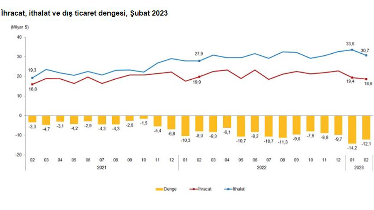 TÜİK, Şubat 2023 dönemine ilişkin dış ticaret istatistiklerini açıkladı. Buna göre; ihracat 2023 Şubat ayında, bir önceki yılın aynı ayına göre yüzde 6,4 azalarak 18 milyar 635 milyon dolar, ithalat yüzde 10,1 artarak 30 milyar 714 milyon dolar olarak gerçekleşti. İhracat 2023 yılı Ocak-Şubat döneminde bir önceki yılın aynı dönemine göre yüzde 1,4 artarak 37 milyar 992 milyon dolar, ithalat yüzde 15,4 artarak 64 milyar 320 milyon dolar olarak gerçekleşti.