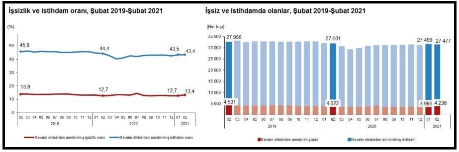 Türkiye genelinde 15 ve daha yukarı yaştaki kişilerde mevsim etkisinden arındırılmış işsizlik Şubat’ta aylık bazda 0.7 puanlık artış ile yüzde 13.4’e yükselirken, aynı dönemde istihdam oranı 0.1 puanlık azalış ile yüzde 43.4 düzeyine geriledi.