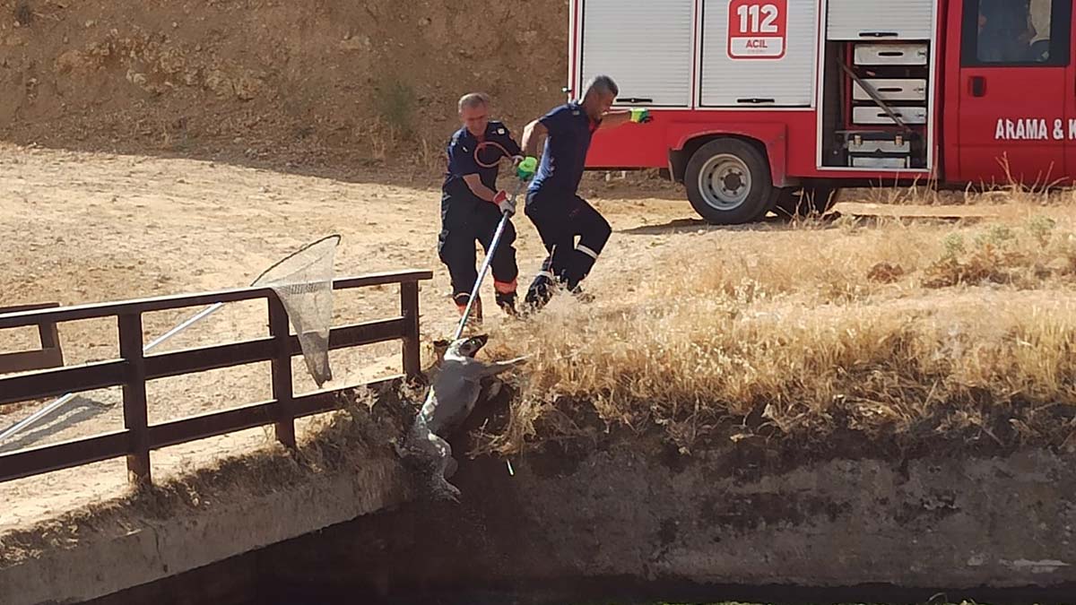Mardin’in Nusaybin ilçesinde sulama kanalına düşen 3 köpek, itfaiye ekiplerinin çalışmasıyla kurtarıldı.