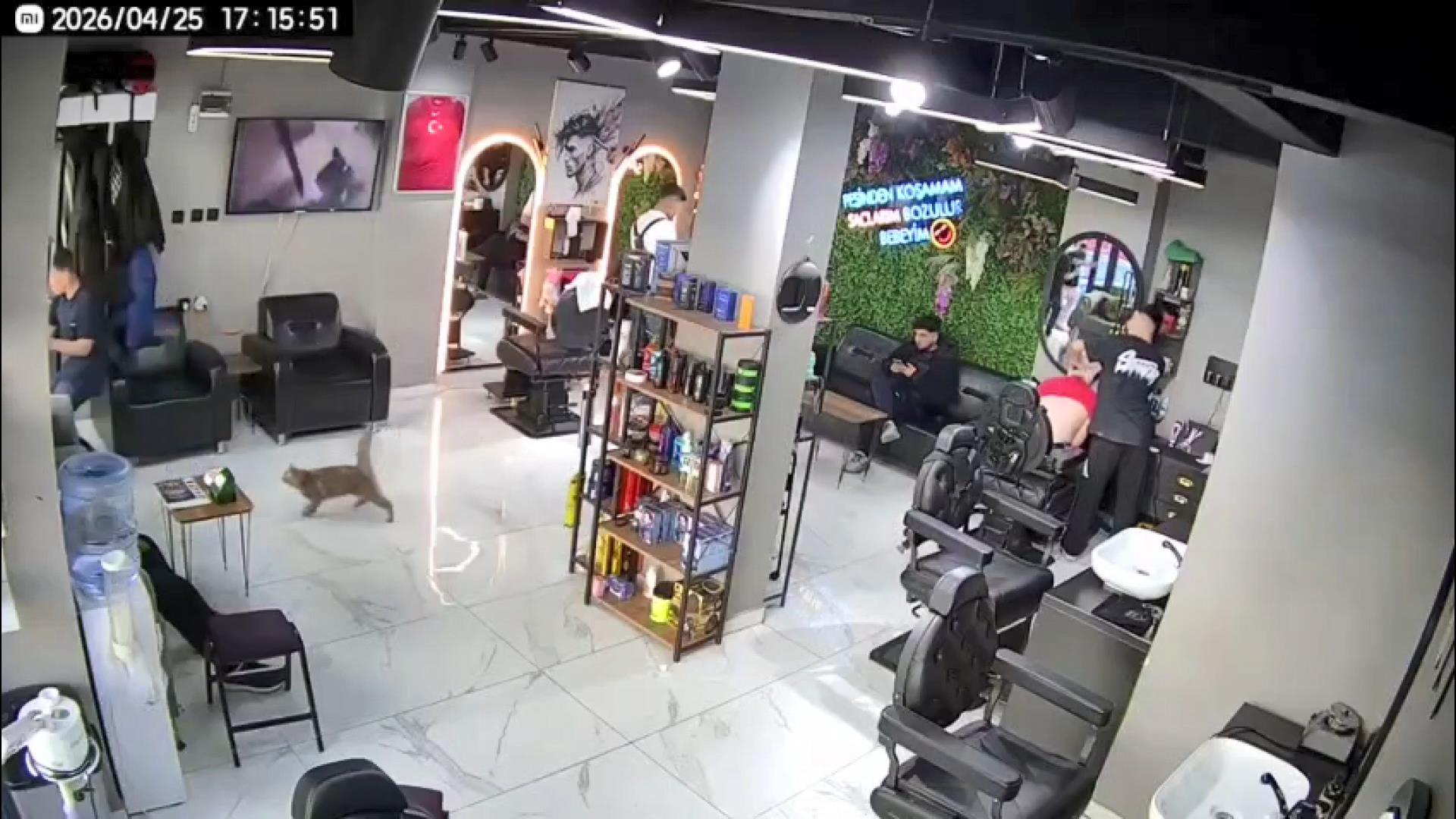 Sultangazi’ de kuaför salonunda bakılan kedi, kendisiyle ilgilenen müşterileri kovalamaya başladı. Panikle koşan müşteriler kediden kurtulmak için merdivenden atlayarak dışarı kaçtı. O anlar iş yerinin güvenlik kamerasına yansıdı.