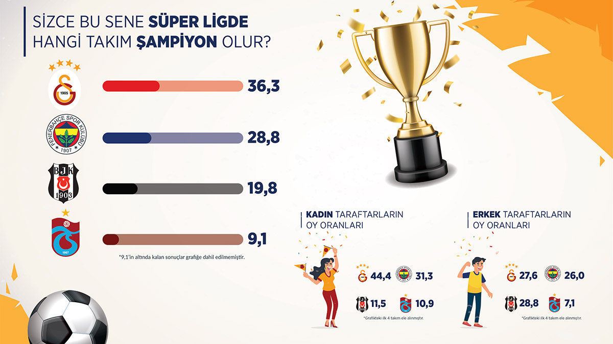 Ağustos ayında başlayan süper ligde geride bırakılan iki ayın sonunda bu sene kimin şampiyon olacağı da merak konusu haline geldi. Katılımcılara “Sizce bu sene süper ligde hangi takım şampiyon olur?” sorusunun sorulduğu araştırmada yüzde 36,3 ile Galatasaray şampiyonluk koltuğuna oturdu. Galatasaray’ı yüzde 28,8 ile Fenerbahçe, yüzde 19,8 ile Beşiktaş ve yüzde 9,1 ile Trabzonspor takip etti.