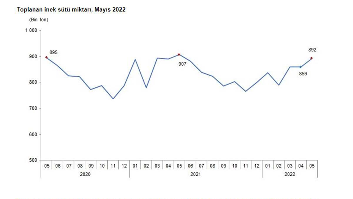 Türkiye İstatistik Kurumu’ndan (TÜİK) Mayıs 2022 süt ve süt ürünleri üretimine ilişkin açıklanan verilere göre; geçen yıla kıyasla ticari süt işletmeleri tarafından yapılan ayran üretimi yüzde 36,6, tereyağı üretimi yüzde 8,3, içme sütü üretimi yüzde 6,2, yoğurt üretimi yüzde 5,9 artarken; inek peyniri üretimi yüzde 3,6, toplanan inek sütü miktarı yüzde 1,6 azaldı. Ocak-mayıs döneminde önceki yılın aynı dönemine göre, tereyağı üretimi yüzde 41,2, ayran üretimi yüzde 30,7, yoğurt üretimi yüzde 4,1 artarken; içme sütü üretimi yüzde 6,5, inek peyniri üretimi yüzde 5,2 ve toplanan inek sütü miktarı yüzde 2,8 azaldı.