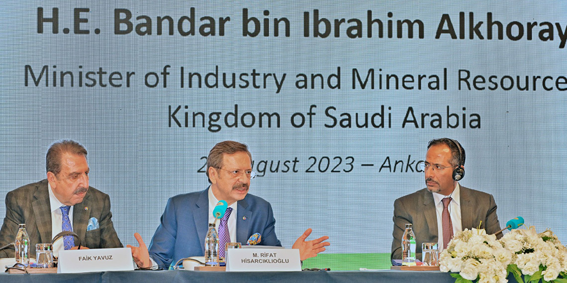 Suudi Arabistan Sanayi ve Maden Kaynakları Bakanı Alkhorayef ise ziyaretinde özel sektörle buluşmaya özen gösterdiğini belirterek, “Politik ilişkilerin ekonomik aktivitelerle tamamlanması gerekiyor. Çok şükür iki ülke arasında ilişkiler çok iyi durumdadır. Özellikle büyük bir özen gösterildiği için iki ülkenin liderleri bu hususa çok önem gösteriyor. Biz Suudi Arabistan ve Türkiye arasındaki son yıllardaki olumlu gelişmeler de siyasi ve ticari ilişkilere olumlu olarak yansımıştır. Bu gelişmeler bizim 2030 vizyonumuz için çok önemli. Sanayi, enerji, lojistik ve madencilik sektörleri bizim için oldukça önemlidir” değerlendirmesinde bulundu.