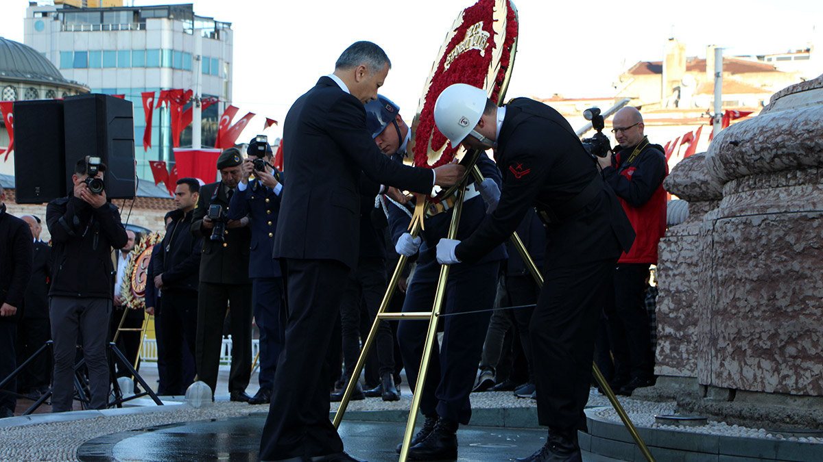 Cumhuriyet Anıtı’na çelenklerin konulmasından sonra saat 09.05’te siren çalmaya başladı. Bayraklar yarıya indirildi. Saygı duruşundan sonra İstiklal Marşı okundu. Anıt çevresinde toplanan vatandaşlar da saygı duruşunda bulundu. Tören nedeniyle binaların üzerinde özel harekat polisleri güvenlik önlemi alırken polis helikopteri de havada tur attı.