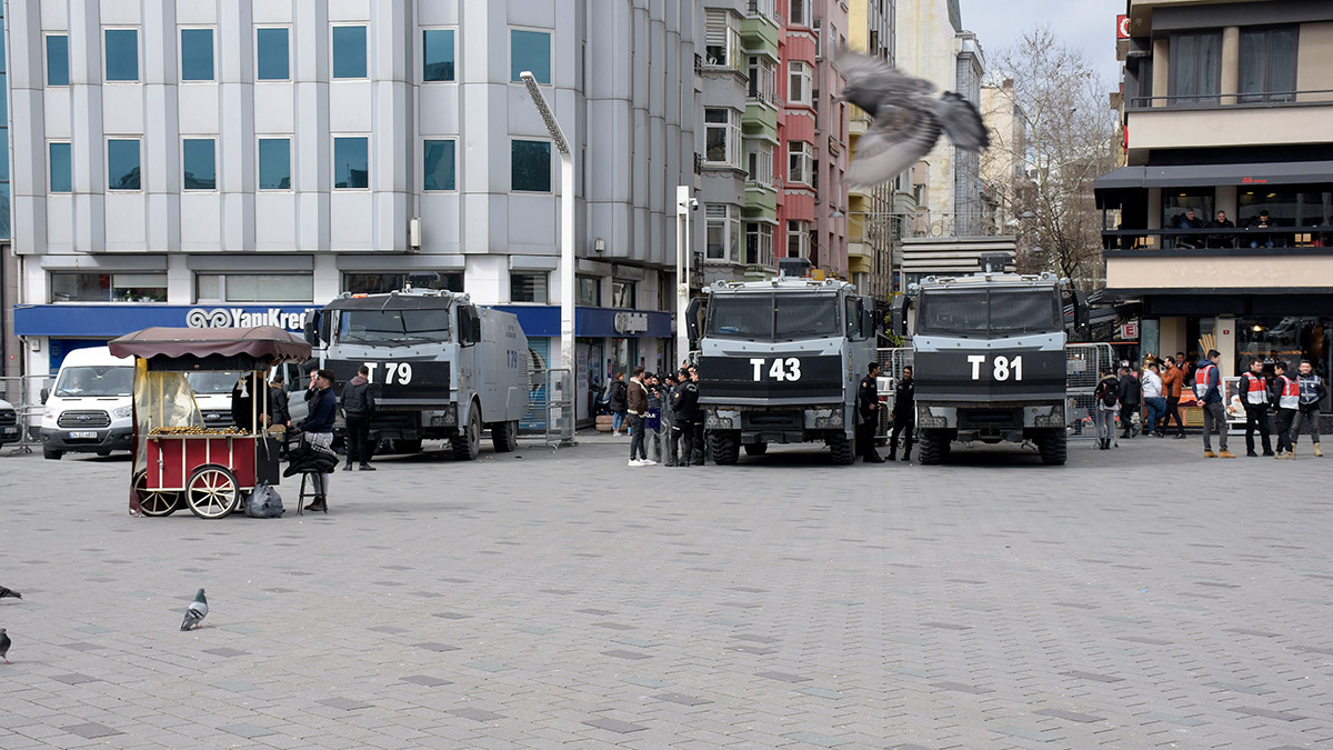 8 Mart Dünya Kadınlar Günü nedeniyle Taksim’de saat 19.30’da yapılması planlanan ‘Feminist Gece Yürüyüşü’ öncesi güvenlik önlemleri alındı. Önlemler kapsamında Taksim Meydanı, İstiklal Caddesi ve ara sokaklar demir bariyerlerle kapatılmaya başlanırken, birçok noktaya Toplumsal Olaylara Müdahale Aracı (TOMA) ve zırhlı araç getirildi. Demir bariyerlerle çevrelenen Gezi Parkı önüne Kent Güvenlik Yönetim Sistemi (KGYS) TIR’ı konuşlandırılırken, polis ekipleri de çevrede güvenlik önlemi aldı.