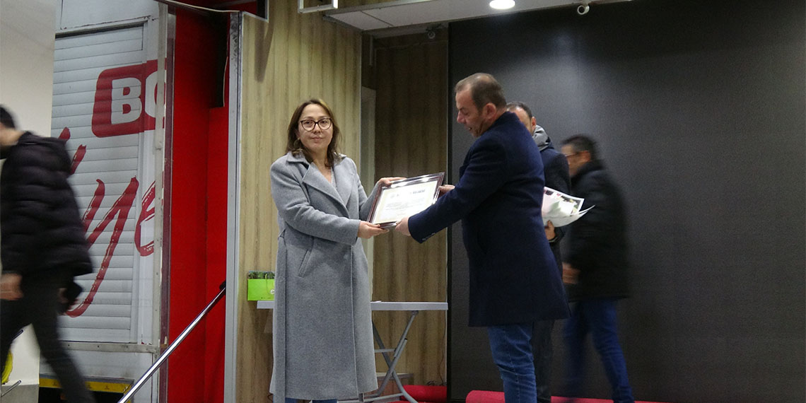 Başkan Özcan konuşmasının ardından soruşturma kapsamında tutuklanan Bolu Belediye Başkan Yardımcısı Sedat Gülener’in eşi Gülten Gülener, İtfaiye Müdürü Kenan Çoban’ın eşi Yasemin Coşkun ve itfaiye personeli İrfan Acar’ın eşi Tuğba Acar ve itfaiye personeline hizmet şeref belgesi verdi.