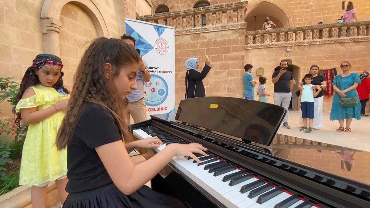 Mardin’in Midyat ilçesinde 12 yaşındaki Arin Aslan, ilçede sivil mimarilerinin en güzel örneklerinden birini yansıtan Devlet Konukevi’nde turistlere konser verdi. Arin, hedefinin Fazıl Say gibi bir sanatçı olmak olduğunu söyledi.