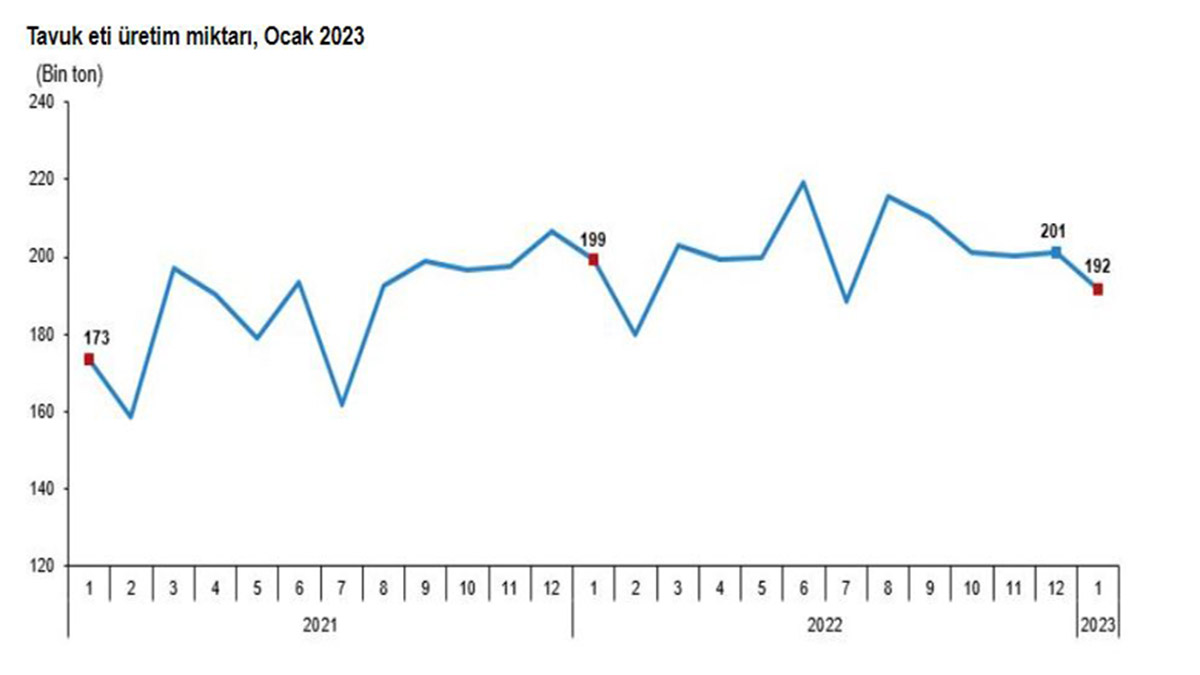 TÜİK, Ocak 2023 dönemine ilişkin kümes hayvancılığı ile süt ve süt ürünleri üretimleri verilerini açıkladı. Depremlerden etkilenen bölgelerden sağlıklı veri ve bilgi elde edilememesi nedeniyle, istatistik üretim süreçlerinde geçici uygulamalar yapıldı. Buna göre, 2023 Ocak ayında tavuk eti üretimi 191 bin 807 ton, tavuk yumurtası üretimi 1 milyar 727 bin 224 adet olarak gerçekleşti. Ocak ayında bir önceki yılın aynı ayına göre tavuk yumurtası üretimi yüzde 3,3 artarken; tavuk eti üretimi yüzde 3,8, kesilen tavuk sayısı yüzde 6 ve hindi eti üretimi yüzde 16,2 azaldı. Tavuk eti üretimi önceki aya göre yüzde 4,6 azaldı.