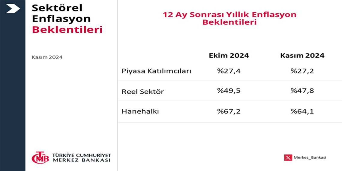Buna göre; 2024 yılı Kasım ayında 12 ay sonrası yıllık enflasyon beklentileri, piyasa katılımcıları için 0,2 puan azalarak yüzde 27,2 seviyesine, reel sektör için 1,7 puan azalarak yüzde 47,8 seviyesine, hane halkı için 3,1 puan azalarak yüzde 64,1 seviyesine geriledi. Gelecek 12 aylık dönemde enflasyonun düşeceğini bekleyen hane halkı oranı, bir önceki aya göre 2 puan azalarak yüzde 26,3 seviyesinde gerçekleşti.