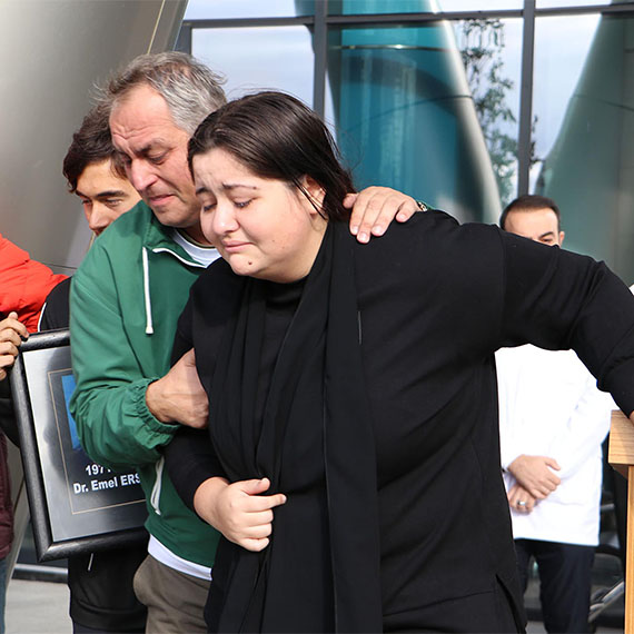 Uzman Doktor Emel Ersöz için de Dr. İsmail Fehmi Cumalıoğlu Şehir Hastanesi’nde uğurlama töreni düzenlendi. Törende, Ersöz’ün çocukları, Selin, Kaan ile annesi Meryem Taşçı gözyaşlarına boğuldu. Törende konuşan başhekim Lütfi Çağatay Onar, Ersöz ile olan anısını anlatarak, “2020 yılının Ekim ayında hem de bugünlerde Tekirdağ Devlet Hastanesi’ne yeni atandığım zaman mesai dışı bir günde hastanenin önünde gördüm kendisini. Elinde bir eczane poşeti vardı. Hastanede bulunmayan bir ilacı kendi yatırdığı hasta için dışarıdan bulmuş, kendi bütçesi ile temin etmiş. Hastaya o ilacı götürüyordu. Hocam geçmiş olsun dedim. ‘Hocam hastamız ile ilgili bir ihtiyaç hasıl oldu ilacı kendim temin ettim’ dedi. İnanın bu ilk değildi, son da değildi. Mesai dışındaki vaktini de hep hastalarını, ilmi düşünerek geçirirdi. Biz kolumuzu, kanadımızı kaybettik, ama anısını yaşatmak için elimizden geleni yapacağız” dedi.