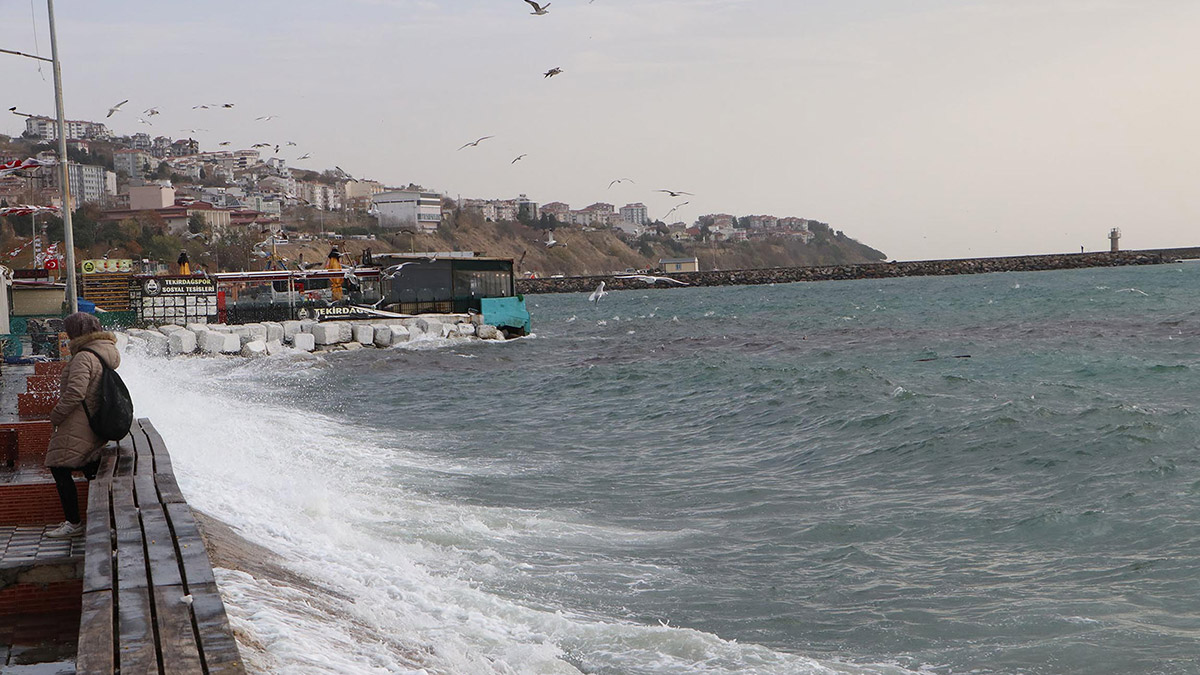 Tekirdağ’da lodos etkili olurken, avlanmak isteyen balıkçılar, limana dönerek teknelerini bağladı; yük gemileri ise açıkta demirlendi.