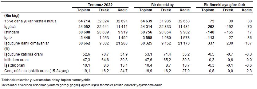 Hanehalkı İşgücü Araştırması sonuçlarına göre; 15 ve daha yukarı yaştaki kişilerde işsiz sayısı 2022 yılı Temmuz ayında bir önceki aya göre 113 bin kişi azalarak 3 milyon 445 bin kişi oldu. İşsizlik oranı ise 0,3 puanlık azalış ile %10,1 seviyesinde gerçekleşti. İşsizlik oranı erkeklerde %8,6 iken kadınlarda %13,1 olarak tahmin edildi.