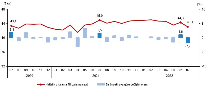 İstihdam edilenlerden referans döneminde işbaşında olanların, mevsim ve takvim etkilerinden arındırılmış haftalık ortalama fiili çalışma süresi 2022 yılı Temmuz ayında bir önceki aya göre 1,2 saat azalarak 43,1 saat olarak gerçekleşti.