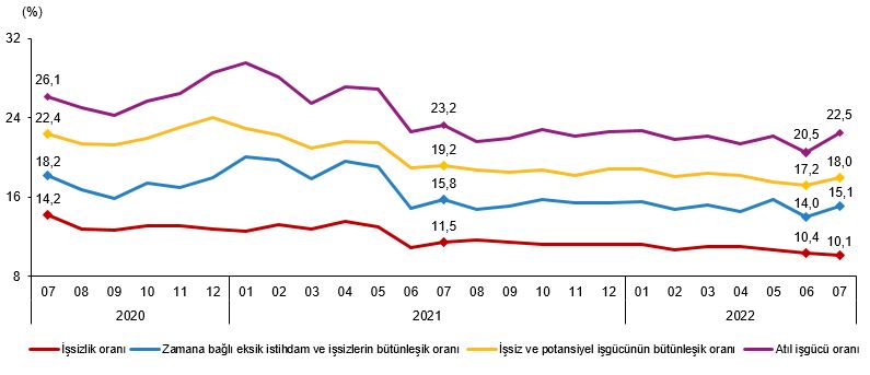 Zamana bağlı eksik istihdam, potansiyel işgücü ve işsizlerden oluşan atıl işgücü oranı 2022 yılı Temmuz ayında bir önceki aya göre 2,0 puan artarak %22,5 oldu. Zamana bağlı eksik istihdam ve işsizlerin bütünleşik oranı %15,1 iken potansiyel işgücü ve işsizlerin bütünleşik oranı %18,0 olarak tahmin edildi.