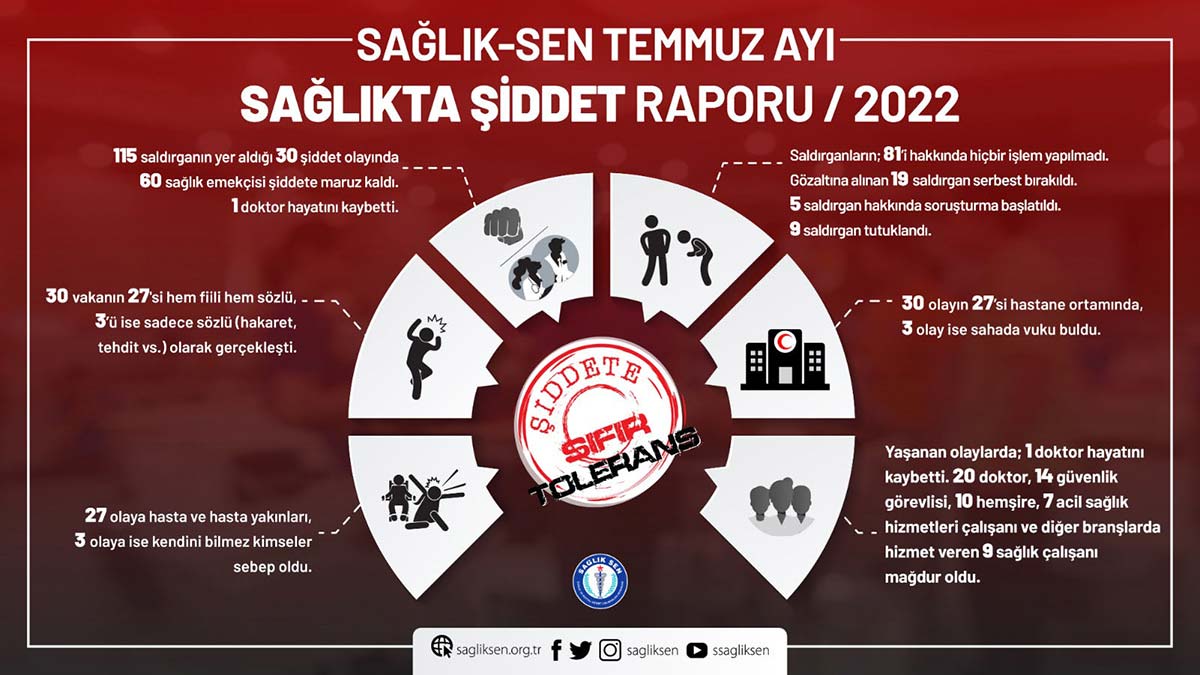 Sağlık-Sen tarafından yapılan yazılı açıklamada, şiddetin en çok hasta ve hasta yakınları tarafından gelmesinin de şiddete karşı toplumsal duyarlılığın oluşturulmasının önemini gösterdiği belirtildi. Şiddete karşı duyarlılığı oluşturacak toplumsal seferberliğin başlatılmasının acilen gerektiği ifade edilen açıklamada, “Temmuz ayında gerçekleştirilen şiddet olaylarına baktığımızda, 115 saldırganın neden olduğu 30 şiddet vakasında 60 sağlık çalışanının mağdur olduğunu görüyoruz. Çok üzgünüz ki, 1 doktor hayatını kaybetti.